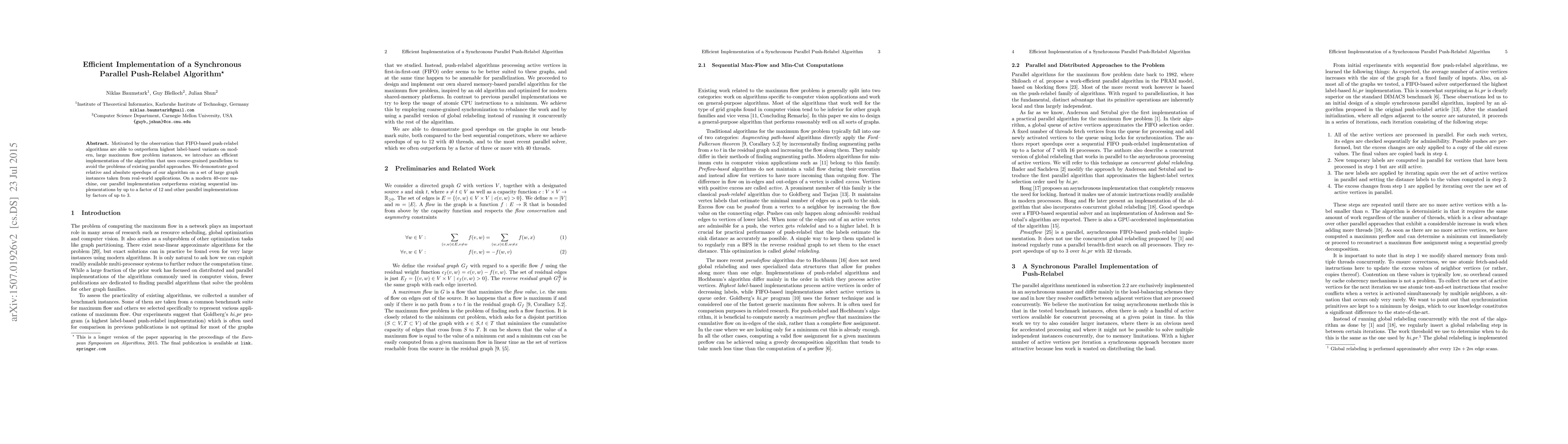 This paper presents a parallel push-relabel algorithm leveraging coarse-grained parallelism to achieve significant speedups for large maximum flow problems. On a 40-core machine, the new implementation outperforms both sequential and existing parallel versions by factors of up to 12 and 3, respectively.