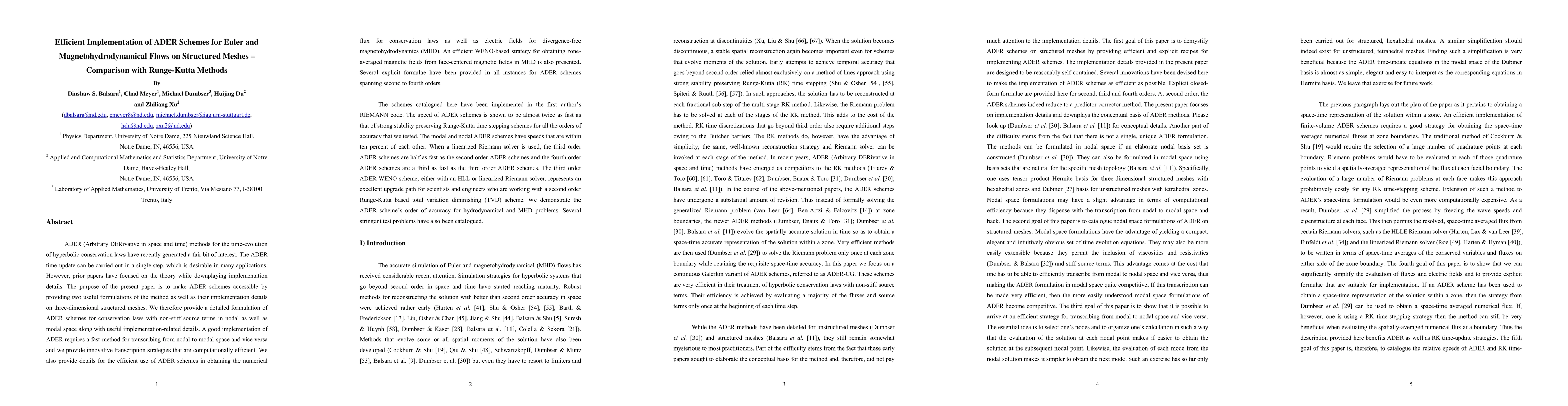 ADER (Arbitrary DERivative in space and time) methods for the time-evolution of hyperbolic conservation laws have recently generated a fair bit of interest. The ADER time update can be carried out in a single step, which is desirable in many applications. However, prior papers have focused on the theory while downplaying implementation details. The purpose of the present paper is to make ADER schemes accessible by providing two useful formulations of the method as well as their implementation details on three-dimensional structured meshes. We therefore provide a detailed formulation of ADER schemes for conservation laws with non-stiff source terms in nodal as well as modal space along with useful implementation-related detail. We also provide details for the efficient use of ADER schemes in obtaining the numerical flux for conservation laws as well as electric fields for divergence-free magnetohydrodynamics. An efficient WENO-based strategy for obtaining zone-averaged magnetic fields from face-centered magnetic fields in MHD is also presented. The schemes catalogued here have been implemented in the first author's RIEMANN code. The speed of ADER schemes is shown to be almost twice as fast as that of strong stability preserving Runge-Kutta time stepping schemes for all the orders of accuracy that we tested.