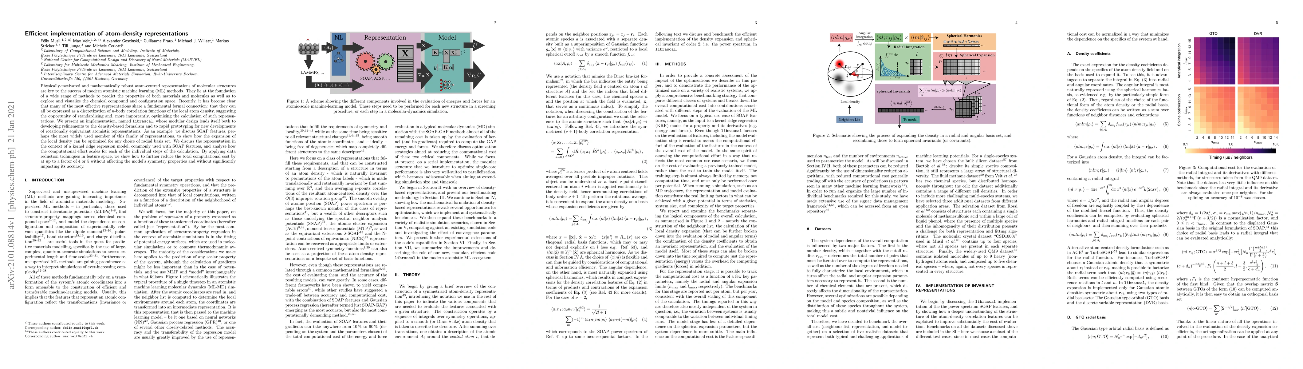 The paper presents librascal, an efficient implementation for atom-density representations, optimizing the calculation of N-body correlation functions of local atom density. It demonstrates significant computational cost reduction through data reduction techniques, achieving up to a fivefold reduction in total computational cost without compromising accuracy or symmetry properties.