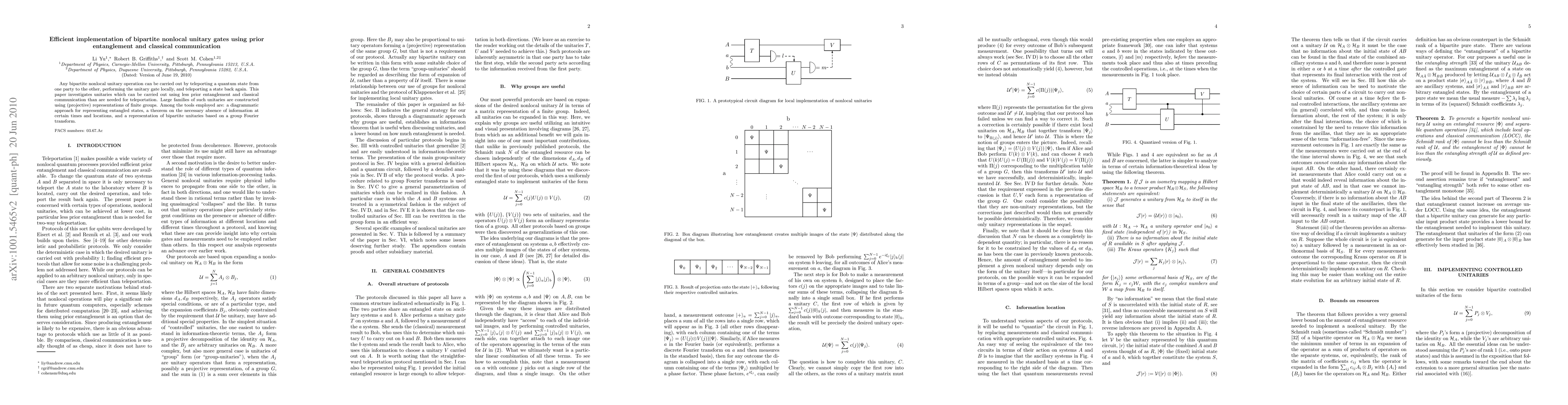 This paper explores efficient implementations of bipartite nonlocal unitary gates by utilizing less prior entanglement and classical communication than traditional teleportation methods. It constructs large families of such unitaries using representations of finite groups, employing tools like a diagrammatic state representation and a group Fourier transform.