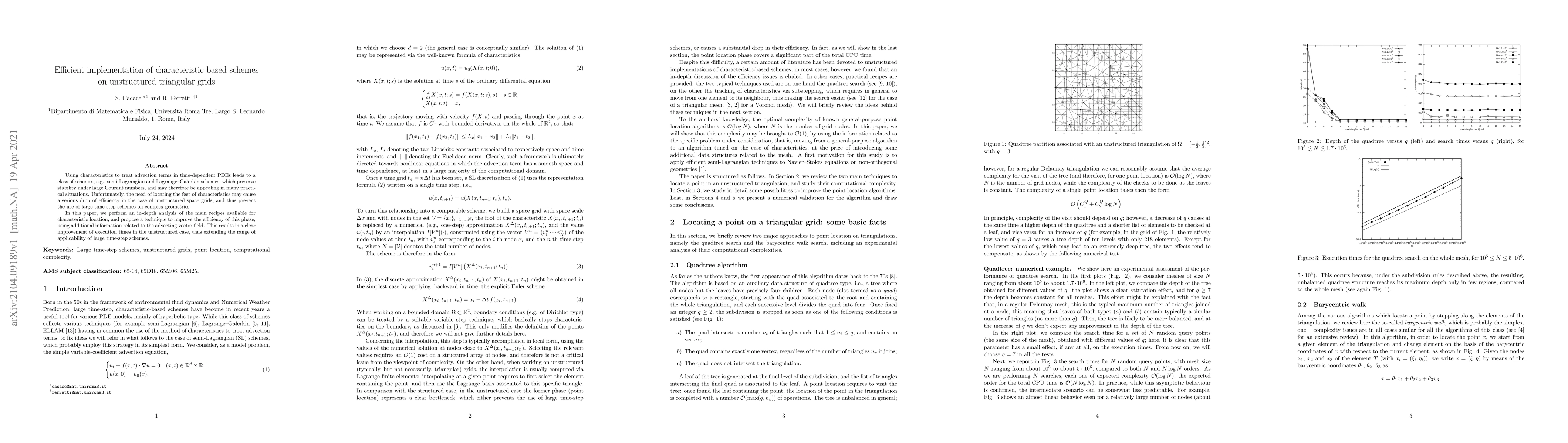 This paper analyzes methods for locating characteristics in semi-Lagrangian schemes on unstructured grids, proposing an efficient technique that leverages advecting vector field information to enhance execution times, thereby broadening the use of large time-step schemes on complex geometries.