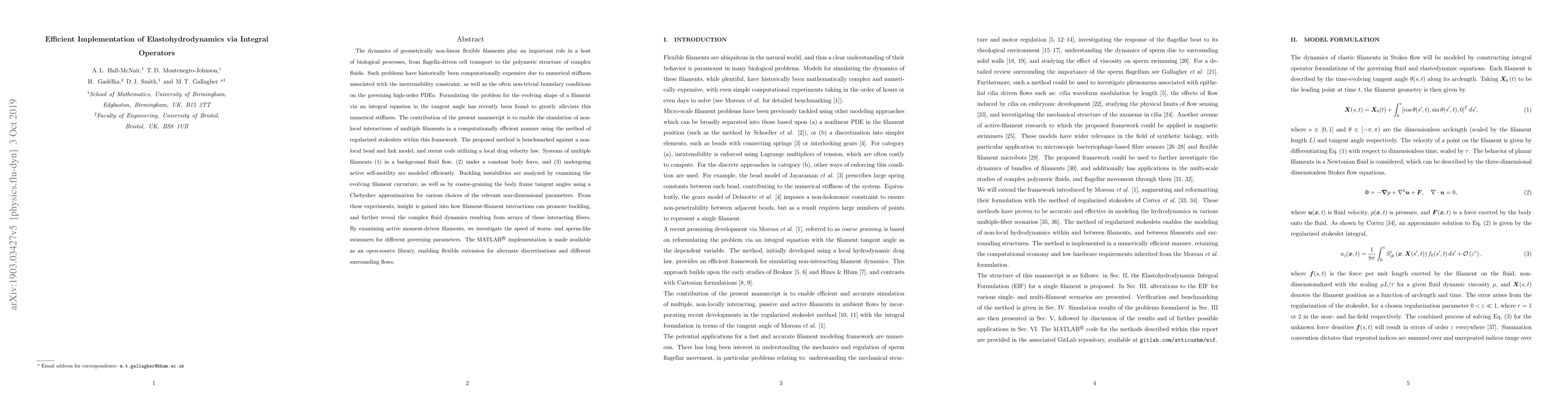 The dynamics of geometrically non-linear flexible filaments play an important role in a host of biological processes, from flagella-driven cell transport to the polymeric structure of complex fluids. Such problems have historically been computationally expensive due to numerical stiffness associated with the inextensibility constraint, as well as the often non-trivial boundary conditions on the governing high-order PDEs. Formulating the problem for the evolving shape of a filament via an integral equation in the tangent angle has recently been found to greatly alleviate this numerical stiffness. The contribution of the present manuscript is to enable the simulation of non-local interactions of multiple filaments in a computationally efficient manner using the method of regularized stokeslets within this framework. The proposed method is benchmarked against a non-local bead and link model, and recent code utilizing a local drag velocity law. Systems of multiple filaments (1) in a background fluid flow, (2) under a constant body force, and (3) undergoing active self-motility are modeled efficiently. Buckling instabilities are analyzed by examining the evolving filament curvature, as well as by coarse-graining the body frame tangent angles using a Chebyshev approximation for various choices of the relevant non-dimensional parameters. From these experiments, insight is gained into how filament-filament interactions can promote buckling, and further reveal the complex fluid dynamics resulting from arrays of these interacting fibers. By examining active moment-driven filaments, we investigate the speed of worm- and sperm-like swimmers for different governing parameters. The MATLAB(R) implementation is made available as an open-source library, enabling flexible extension for alternate discretizations and different surrounding flows.