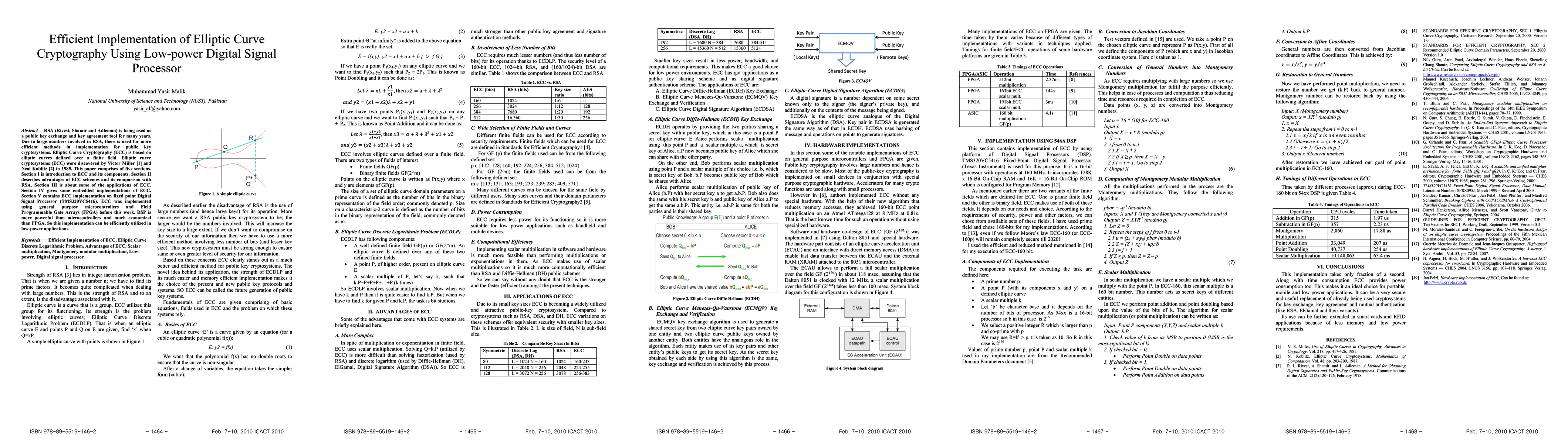 RSA(Rivest, Shamir and Adleman)is being used as a public key exchange and key agreement tool for many years. Due to large numbers involved in RSA, there is need for more efficient methods in implementation for public key cryptosystems. Elliptic Curve Cryptography(ECC) is based on elliptic curves defined over a finite field. Elliptic curve cryptosystems(ECC) were discovered by Victor Miller and Neal Koblitz in 1985.This paper comprises of five sections. Section I is introduction to ECC and its components. Section II describes advantages of ECC schemes and its comparison with RSA. Section III is about some of the applications of ECC. Section IV gives some embedded implementations of ECC. Section V contains ECC implementation on fixed point Digital Signal Processor(TMS320VC5416). ECC was implemented using general purpose microcontrollers and Field Programmable Gate Arrays (FPGA) before this work. DSP is more powerful than microcontrollers and much economical than FPGA. So this implementation can be efficiently utilized in low-power applications.