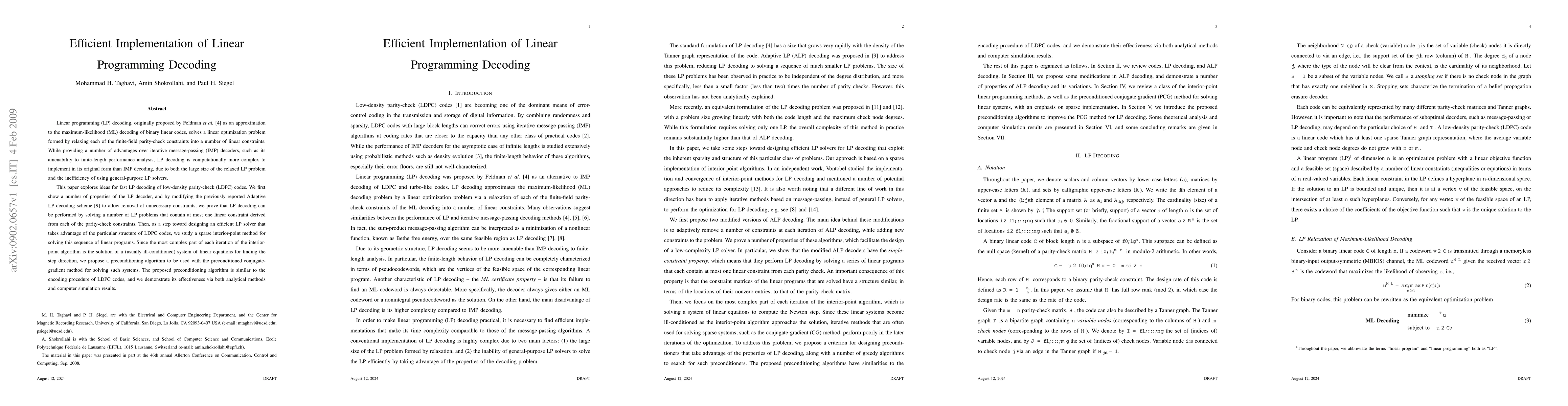 This paper proposes efficient methods for implementing linear programming (LP) decoding of low-density parity-check (LDPC) codes, focusing on reducing computational complexity by solving a series of simplified LP problems and employing a preconditioning algorithm for solving linear systems. The results show improved performance over traditional LP solvers.