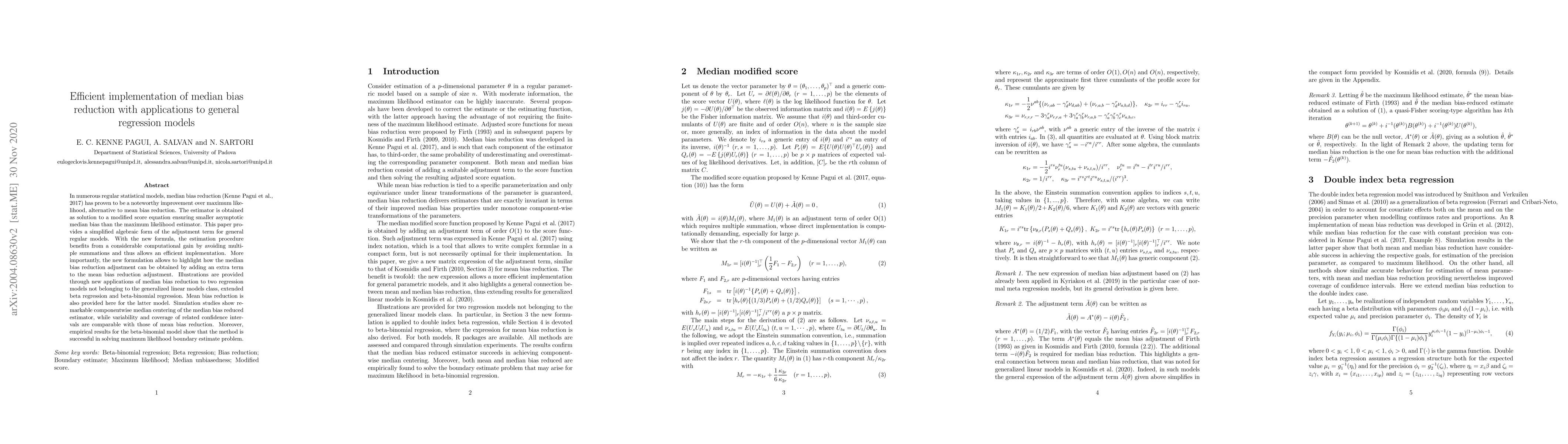 In numerous regular statistical models, median bias reduction (Kenne Pagui et al., 2017) has proven to be a noteworthy improvement over maximum likelihood, alternative to mean bias reduction. The estimator is obtained as solution to a modified score equation ensuring smaller asymptotic median bias than the maximum likelihood estimator. This paper provides a simplified algebraic form of the adjustment term for general regular models. With the new formula, the estimation procedure benefits from a considerable computational gain by avoiding multiple summations and thus allows an efficient implementation. More importantly, the new formulation allows to highlight how the median bias reduction adjustment can be obtained by adding an extra term to the mean bias reduction adjustment. Illustrations are provided through new applications of median bias reduction to two regression models not belonging to the generalized linear models class, extended beta regression and beta-binomial regression. Mean bias reduction is also provided here for the latter model. Simulation studies show remarkable componentwise median centering of the median bias reduced estimator, while variability and coverage of related confidence intervals are comparable with those of mean bias reduction. Moreover, empirical results for the beta-binomial model show that the method is successful in solving maximum likelihood boundary estimate problem.
