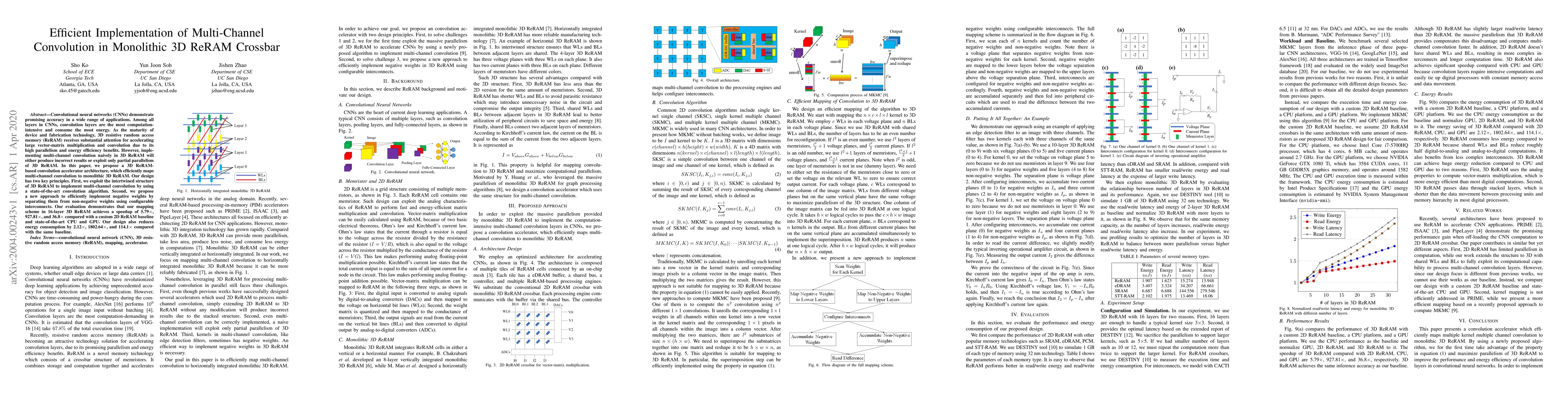 This paper presents an efficient 3D ReRAM-based architecture for multi-channel convolution in CNNs, achieving significant speedups and energy reductions by leveraging the high parallelism and energy efficiency of 3D ReRAM. The proposed design separates negative weights to optimize the use of 3D ReRAM, resulting in substantial performance and energy improvements over 2D ReRAM, CPU, and GPU baselines.