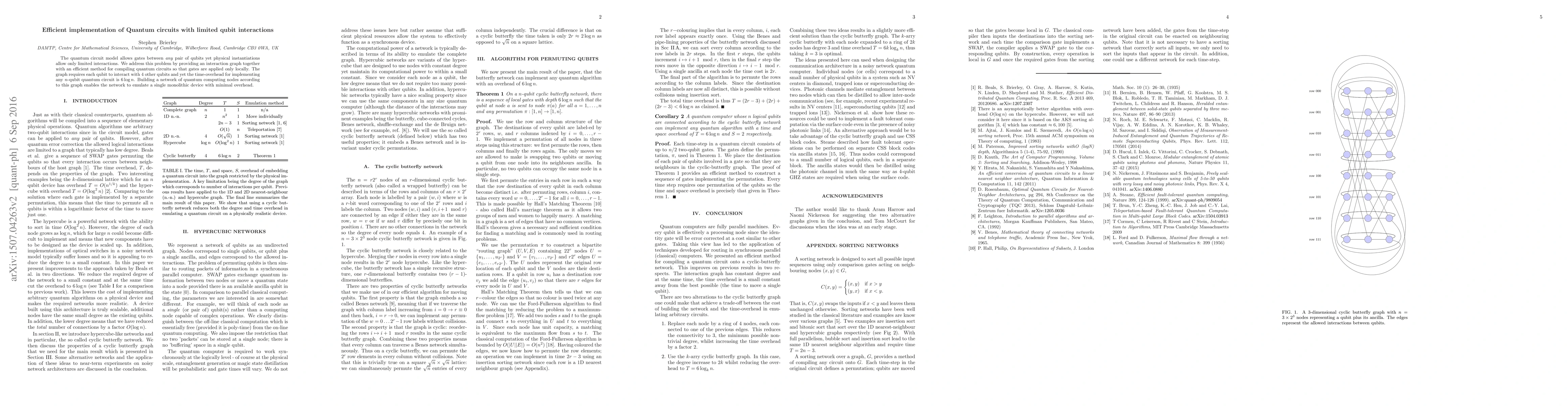 A new method for efficiently implementing quantum circuits on limited qubit interactions is proposed, reducing implementation time to 6 log n, while requiring each qubit to interact with only 4 other qubits.