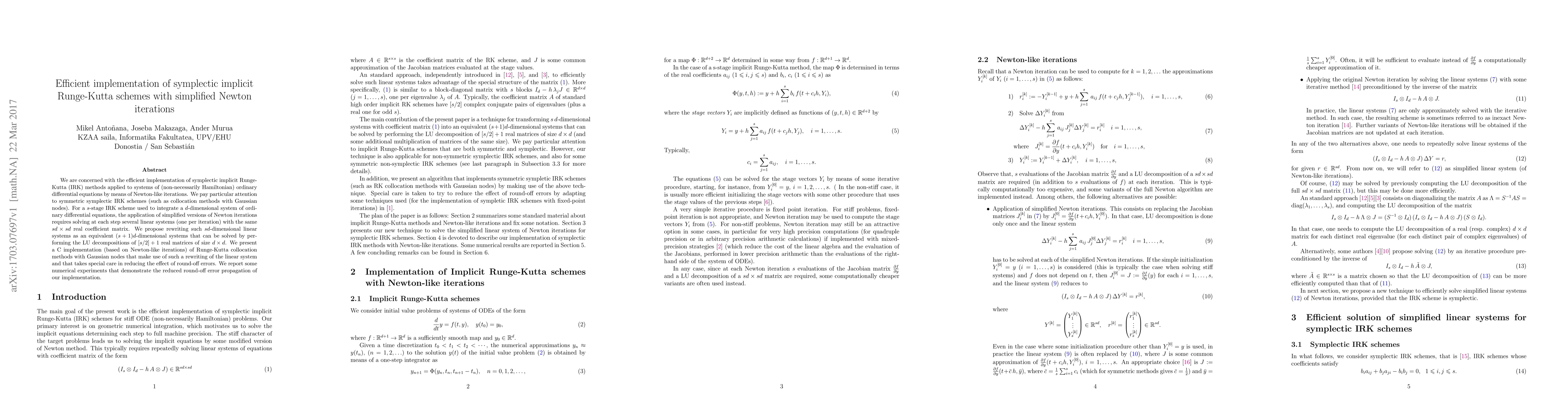 This paper proposes an efficient implementation of symplectic implicit Runge-Kutta methods using simplified Newton iterations, focusing on symmetric schemes with Gaussian nodes. It introduces a method to rewrite linear systems to reduce computational cost and round-off errors, presenting a C implementation that demonstrates improved numerical stability.