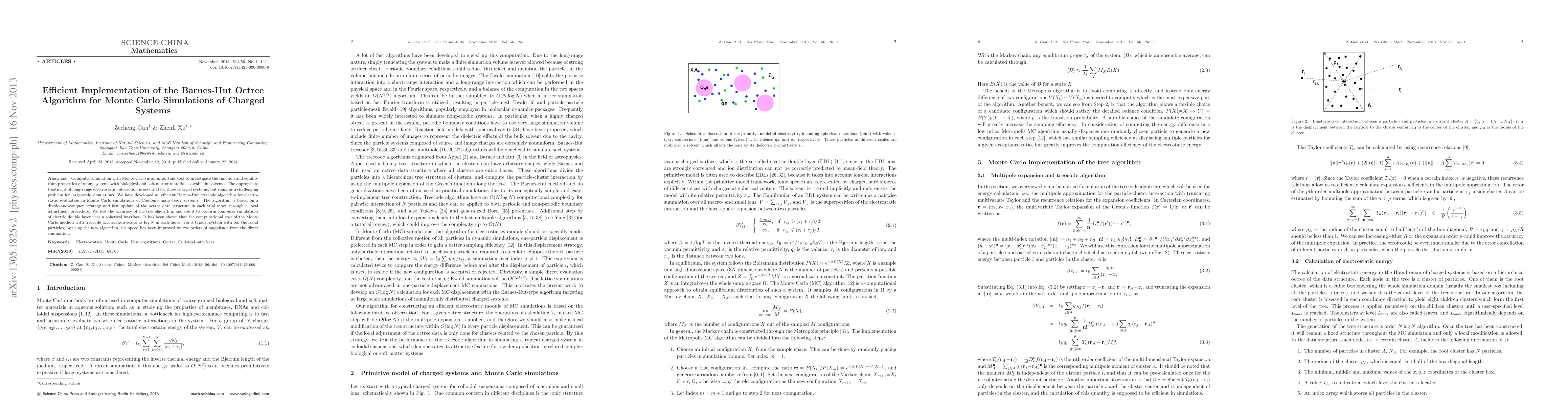 This paper presents an efficient Barnes-Hut octree algorithm for Monte Carlo simulations of charged systems, significantly improving computational speed by reducing electrostatic interaction calculations to $\log N$ complexity. The algorithm's effectiveness is demonstrated through simulations of electric double layers near spherical interfaces.