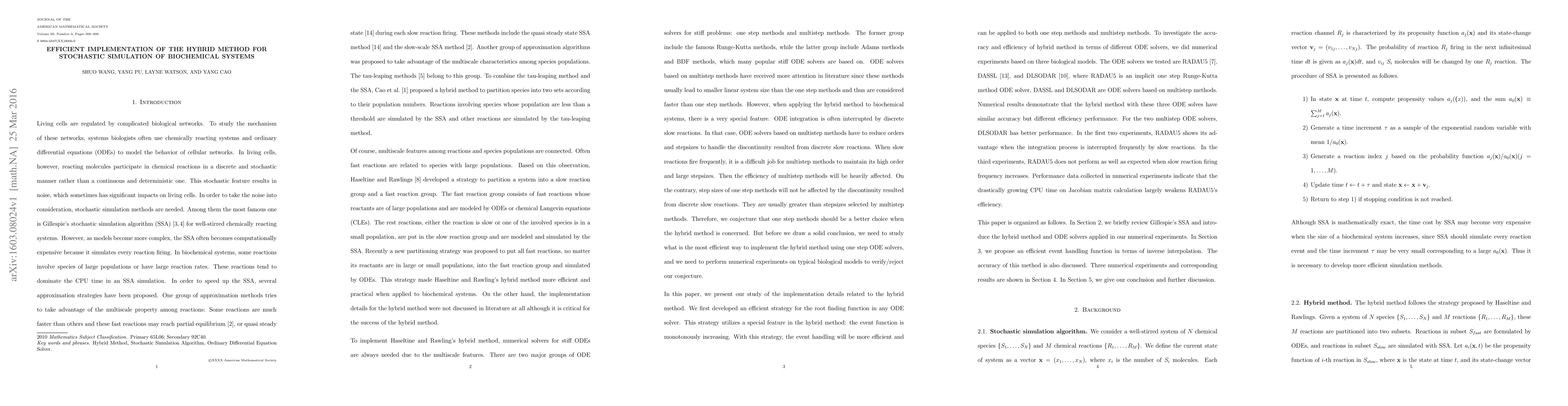 This paper proposes an efficient implementation of the hybrid method for stochastic simulation of biochemical systems, combining ordinary differential equations with stochastic chemical reactions. The authors address the efficiency limitations of the hybrid method and compare it with three ODE solvers, demonstrating improved performance through numerical experiments on three biochemical models.