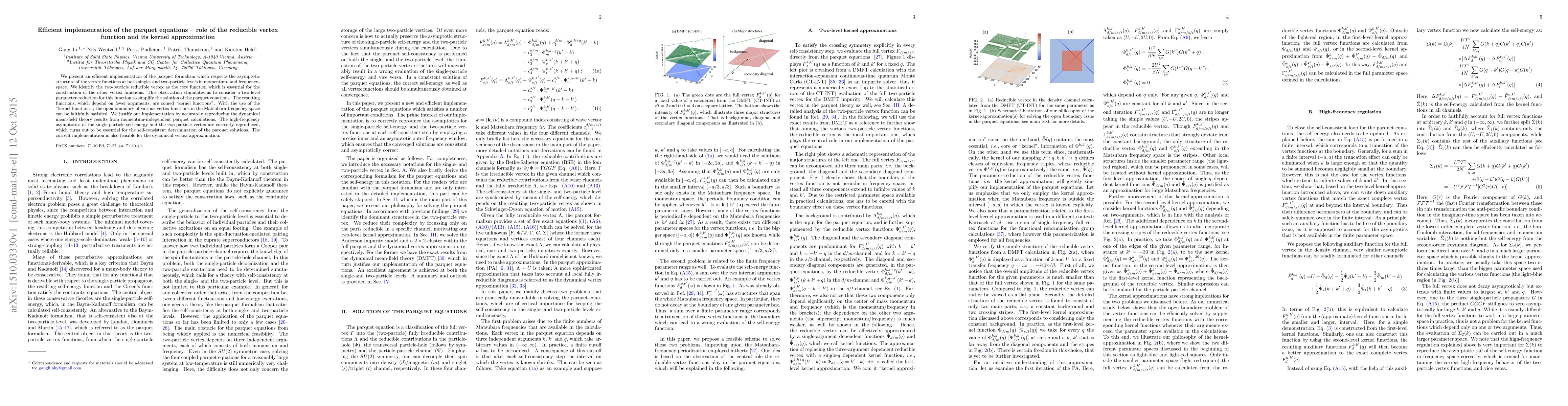 This paper presents an efficient implementation of the parquet formalism, focusing on the two-particle reducible vertex function, which is crucial for constructing other vertex functions. The authors simplify the solution of the parquet equations by introducing "kernel functions" that depend on fewer arguments, ensuring accurate reproduction of dynamical mean-field theory results and correct high-frequency asymptotics.