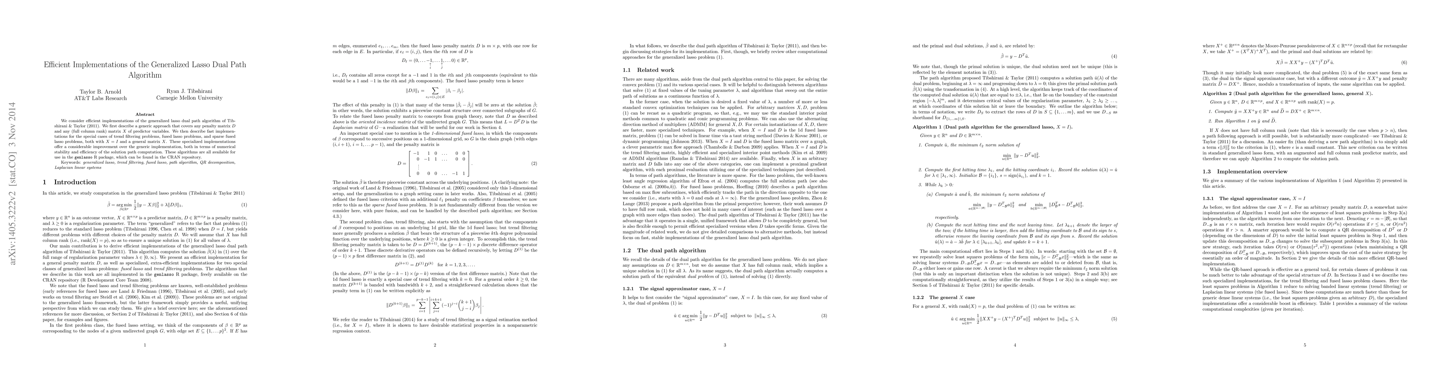 This paper presents efficient implementations of the generalized lasso dual path algorithm, offering specialized versions for trend filtering, fused lasso, and sparse fused lasso problems that significantly improve numerical stability and efficiency. The algorithms are available in the genlasso R package on CRAN.