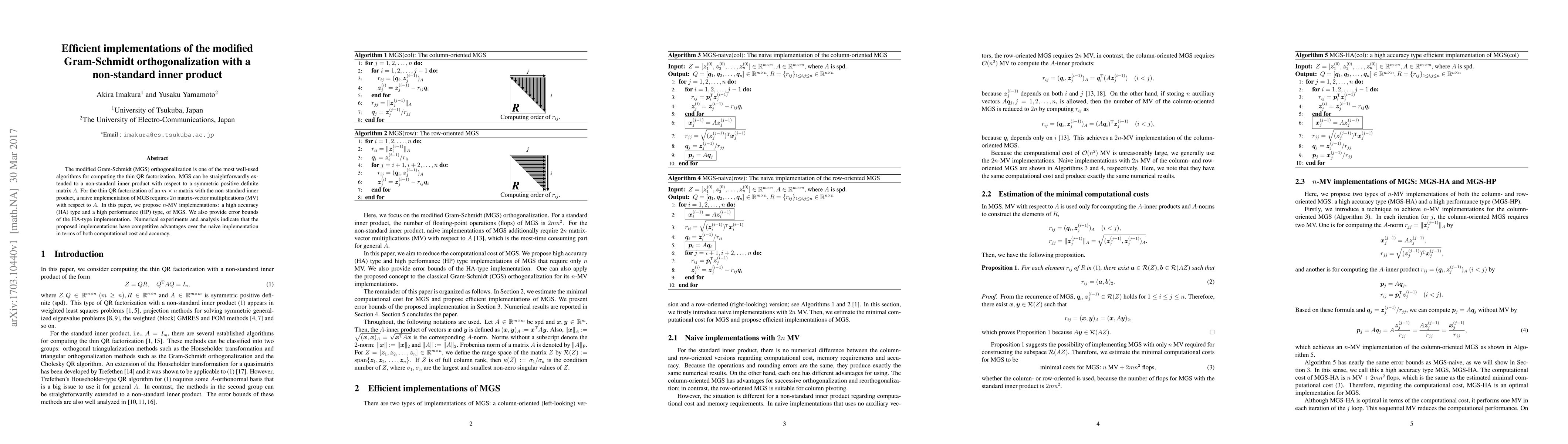 This paper proposes efficient implementations of the modified Gram-Schmidt orthogonalization for thin QR factorization under a non-standard inner product, introducing high accuracy and high performance variants that require $n$ matrix-vector multiplications, outperforming the naive $2n$ MV method in computational efficiency and accuracy.