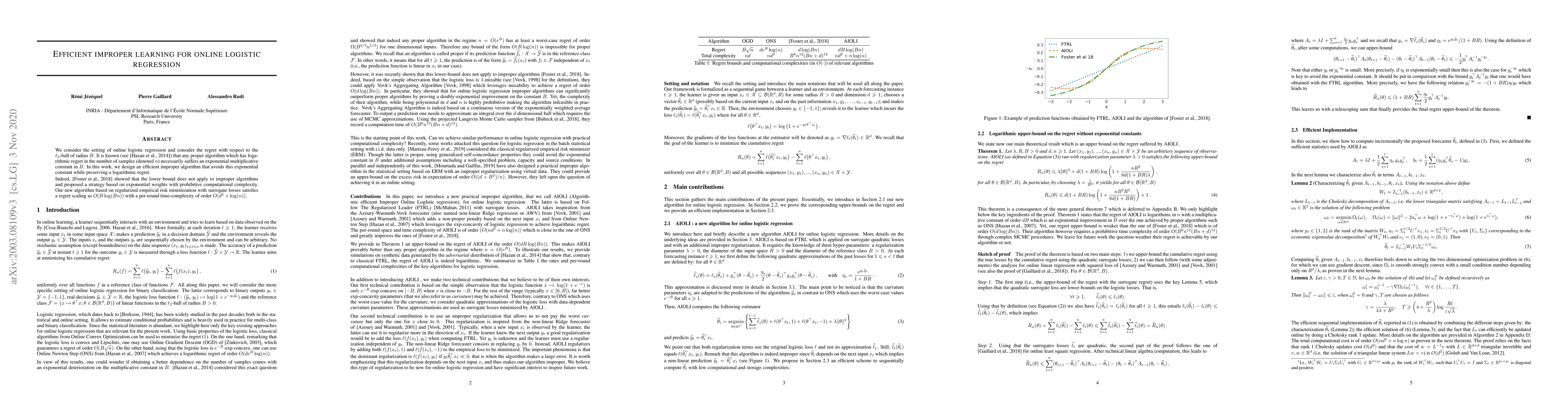 This paper proposes an efficient improper learning algorithm for online logistic regression that achieves logarithmic regret while avoiding the exponential multiplicative constant in the radius B, unlike proper algorithms. The new algorithm uses regularized empirical risk minimization with surrogate losses, scaling the regret as O(B log(Bn)) and maintaining a per-round time complexity of O(d^2).
