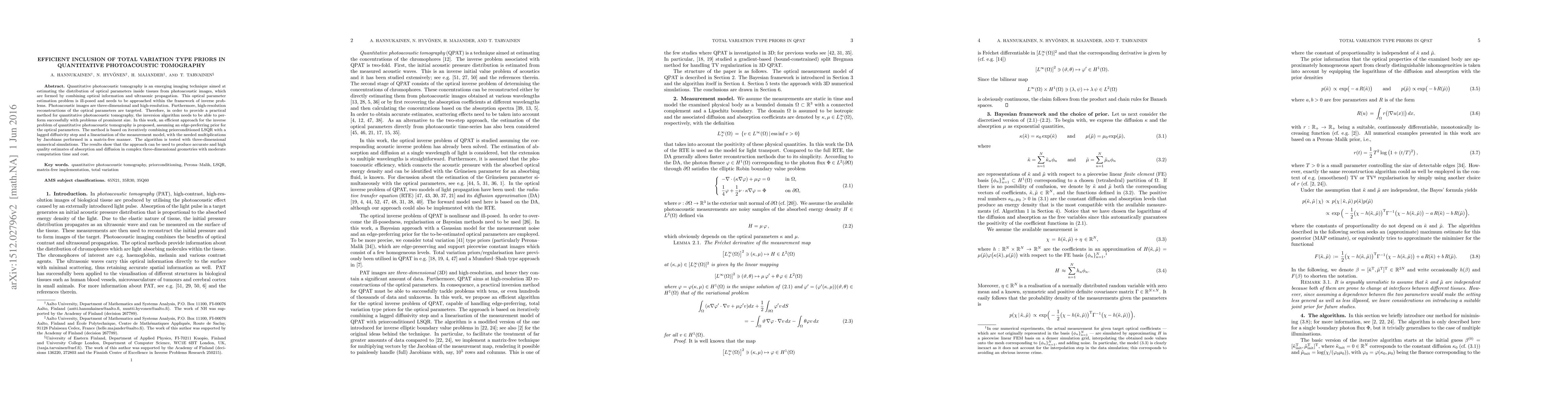 This paper proposes an efficient inversion algorithm for quantitative photoacoustic tomography, incorporating total variation priors to improve high-resolution reconstructions of optical parameters. The method combines LSQR with a lagged diffusivity step and matrix-free Jacobian multiplications, demonstrating accurate and timely results in 3D simulations.
