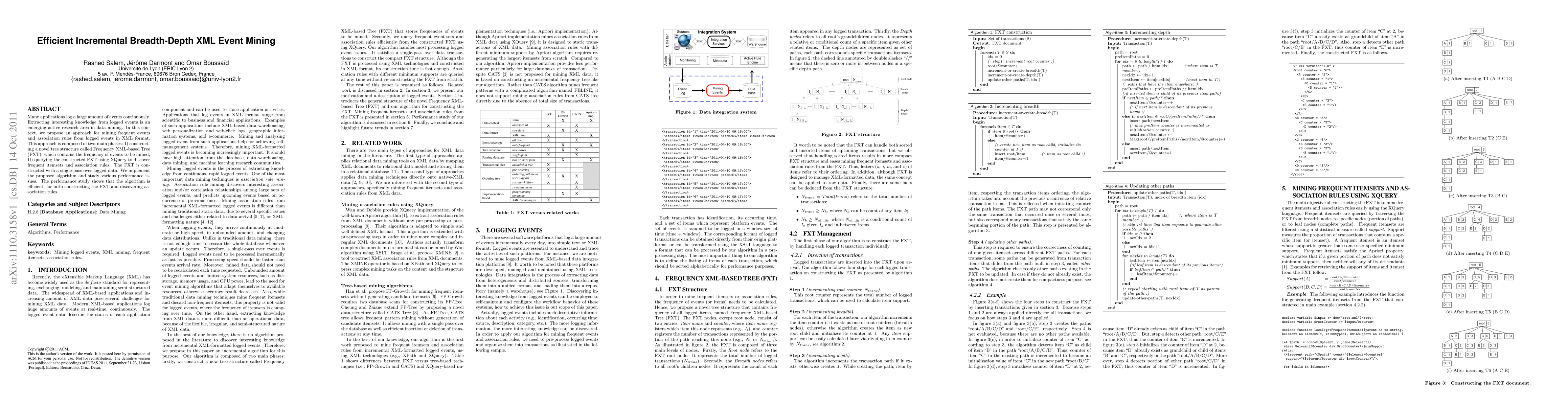 Many applications log a large amount of events continuously. Extracting interesting knowledge from logged events is an emerging active research area in data mining. In this context, we propose an approach for mining frequent events and association rules from logged events in XML format. This approach is composed of two-main phases: I) constructing a novel tree structure called Frequency XML-based Tree (FXT), which contains the frequency of events to be mined; II) querying the constructed FXT using XQuery to discover frequent itemsets and association rules. The FXT is constructed with a single-pass over logged data. We implement the proposed algorithm and study various performance issues. The performance study shows that the algorithm is efficient, for both constructing the FXT and discovering association rules.