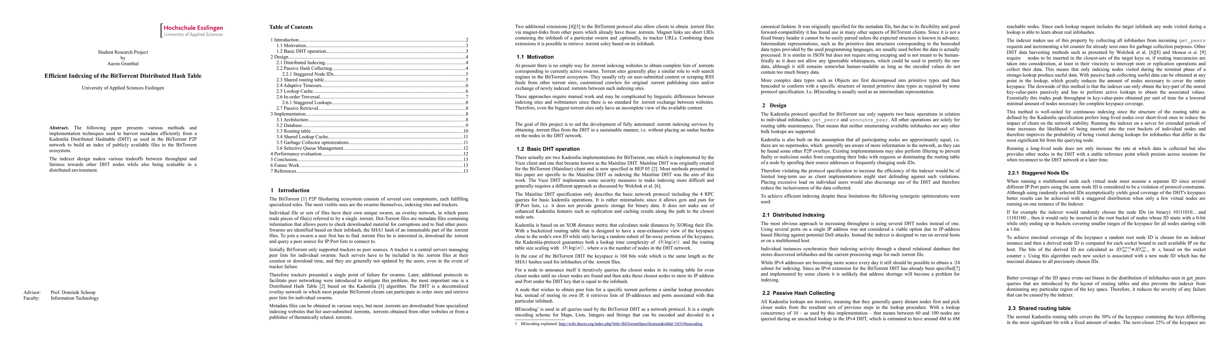This paper explores efficient indexing methods for the BitTorrent DHT, focusing on harvesting metadata to build a public file index, balancing throughput, fairness, and scalability in distributed environments. The design aims to optimize resource usage while maintaining equitable access for other DHT nodes.