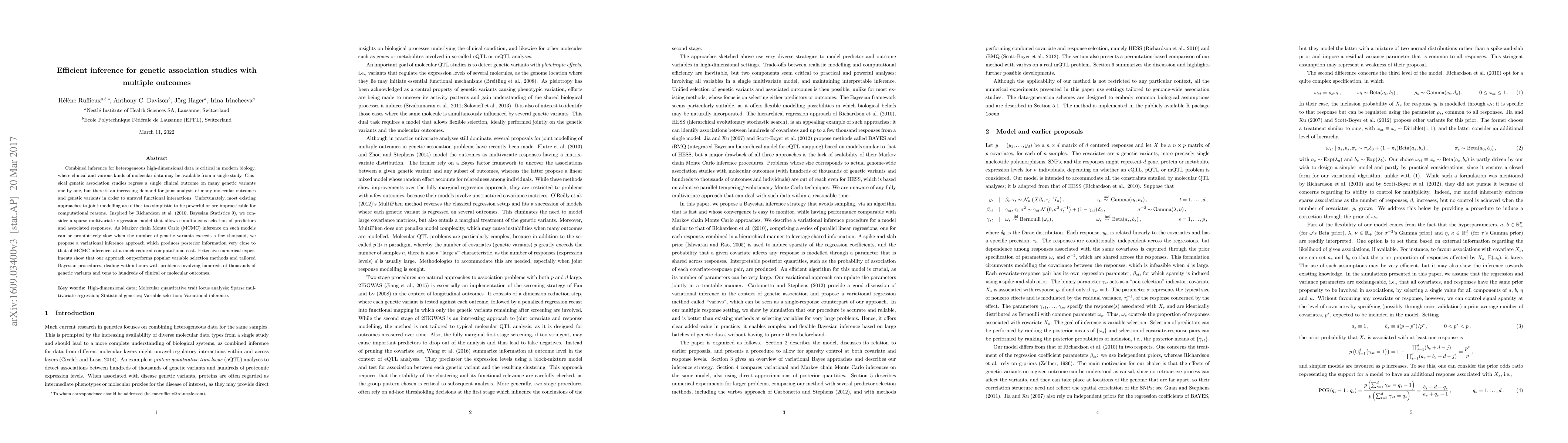 This paper proposes a variational inference method for efficient joint analysis of multiple outcomes in genetic association studies, addressing the computational challenges of high-dimensional data. The approach outperforms existing methods, enabling the analysis of hundreds of thousands of genetic variants and multiple clinical or molecular outcomes within hours.