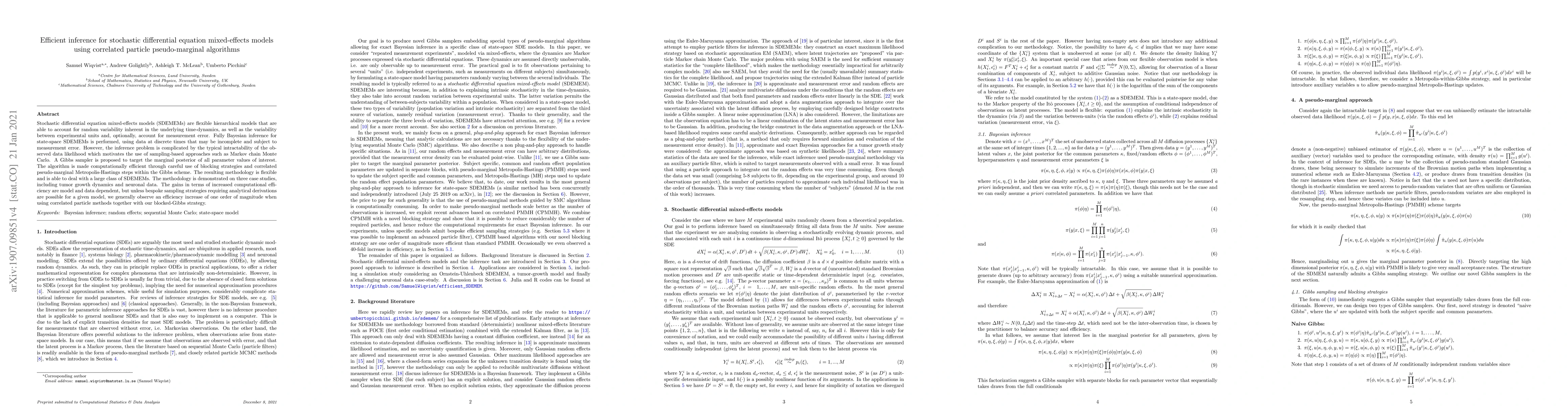 This paper proposes a computationally efficient Gibbs sampler using correlated particle pseudo-marginal algorithms for fully Bayesian inference in stochastic differential equation mixed-effects models. The method achieves significant efficiency gains, typically an order of magnitude, compared to bespoke sampling strategies.