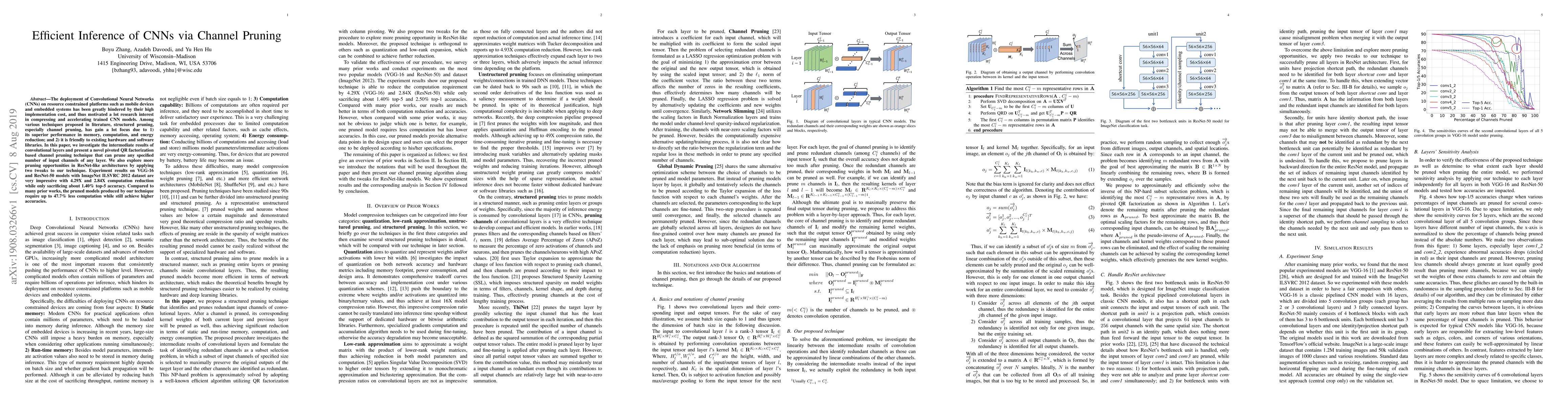 This paper presents a novel channel pruning technique that reduces computation in CNNs while maintaining accuracy, achieving up to 47.7% less computation and 1.40% loss of top-5 accuracy.
