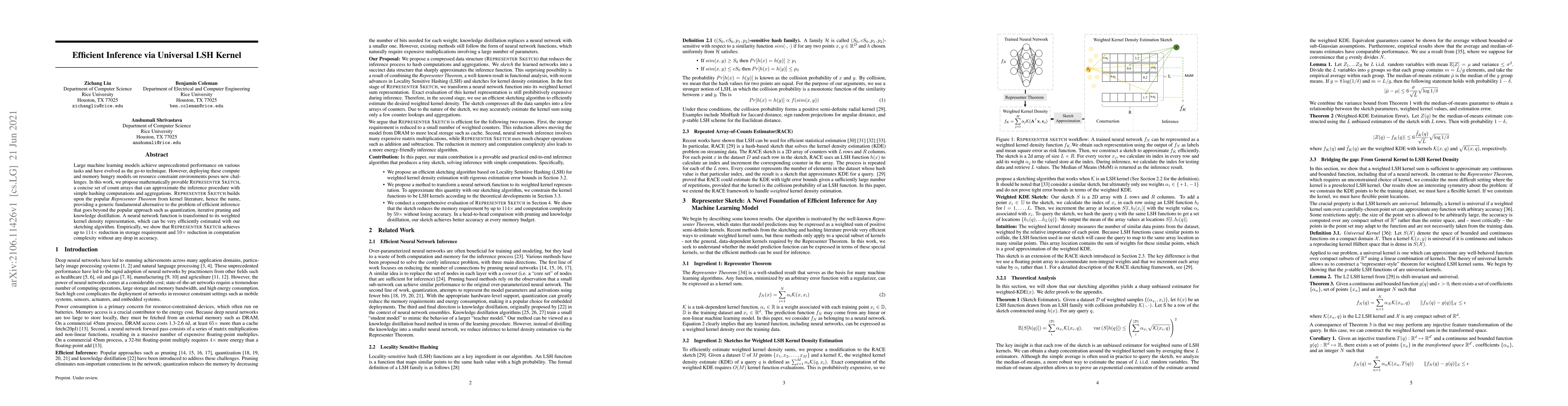 This paper proposes Representer Sketch, a method that uses universal LSH kernels to approximate inference in large machine learning models efficiently. It achieves significant reductions in storage and computation complexity while maintaining accuracy, offering an alternative to traditional techniques like quantization and pruning.