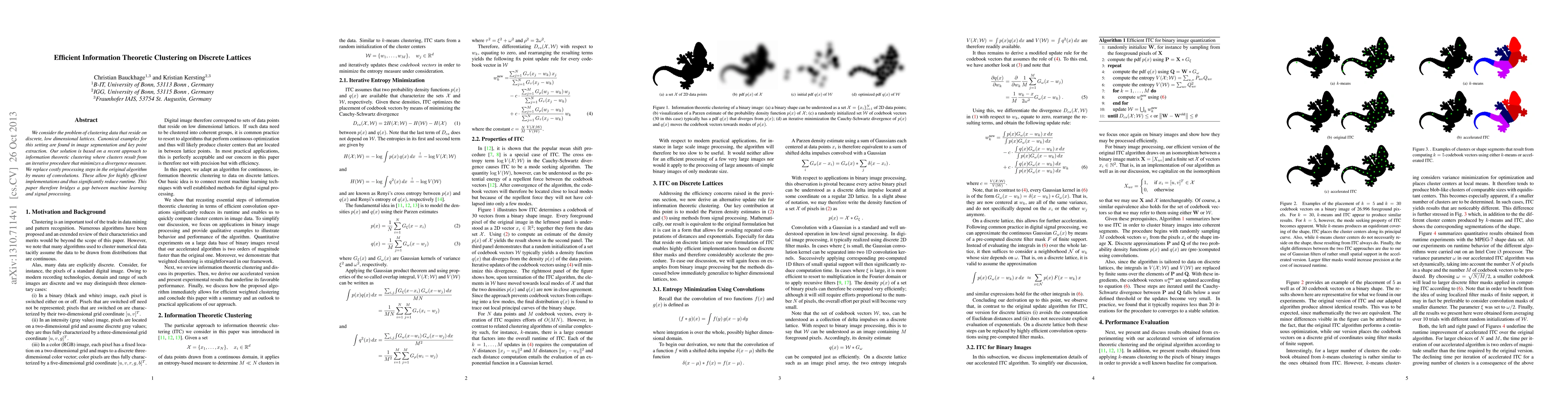 We consider the problem of clustering data that reside on discrete, low dimensional lattices. Canonical examples for this setting are found in image segmentation and key point extraction. Our solution is based on a recent approach to information theoretic clustering where clusters result from an iterative procedure that minimizes a divergence measure. We replace costly processing steps in the original algorithm by means of convolutions. These allow for highly efficient implementations and thus significantly reduce runtime. This paper therefore bridges a gap between machine learning and signal processing.
