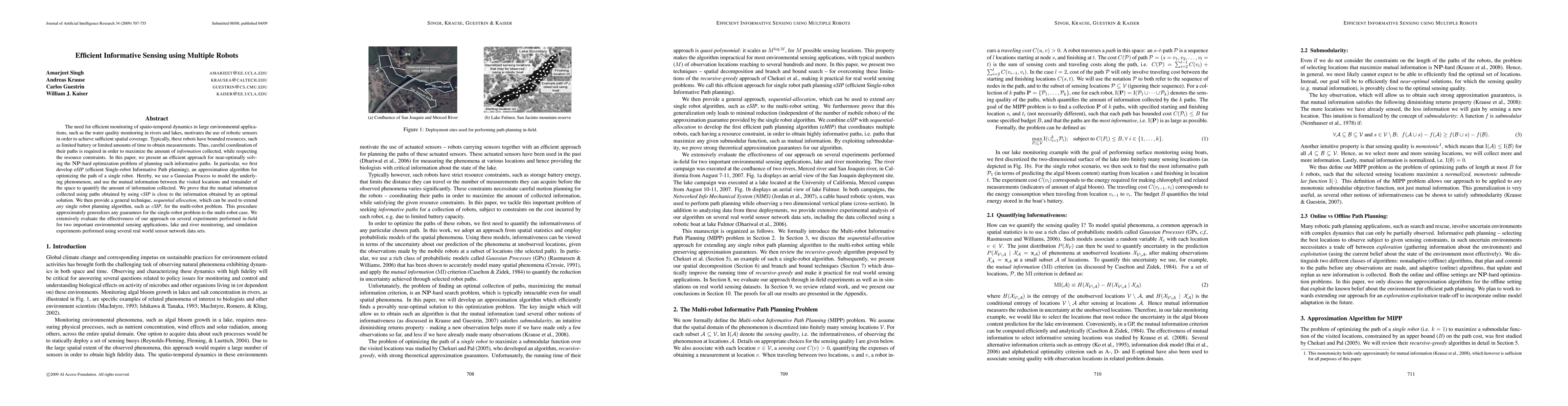 The need for efficient monitoring of spatio-temporal dynamics in large environmental applications, such as the water quality monitoring in rivers and lakes, motivates the use of robotic sensors in order to achieve sufficient spatial coverage. Typically, these robots have bounded resources, such as limited battery or limited amounts of time to obtain measurements. Thus, careful coordination of their paths is required in order to maximize the amount of information collected, while respecting the resource constraints. In this paper, we present an efficient approach for near-optimally solving the NP-hard optimization problem of planning such informative paths. In particular, we first develop eSIP (efficient Single-robot Informative Path planning), an approximation algorithm for optimizing the path of a single robot. Hereby, we use a Gaussian Process to model the underlying phenomenon, and use the mutual information between the visited locations and remainder of the space to quantify the amount of information collected. We prove that the mutual information collected using paths obtained by using eSIP is close to the information obtained by an optimal solution. We then provide a general technique, sequential allocation, which can be used to extend any single robot planning algorithm, such as eSIP, for the multi-robot problem. This procedure approximately generalizes any guarantees for the single-robot problem to the multi-robot case. We extensively evaluate the effectiveness of our approach on several experiments performed in-field for two important environmental sensing applications, lake and river monitoring, and simulation experiments performed using several real world sensor network data sets.