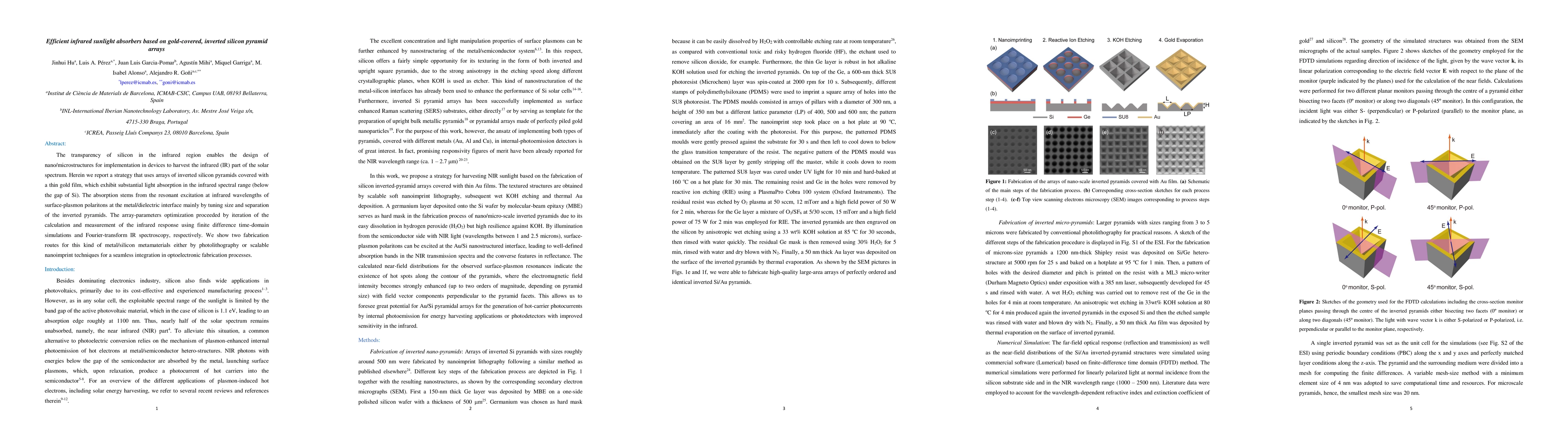 This research introduces a method using gold-covered, inverted silicon pyramid arrays for efficient infrared sunlight absorption, achieved by tuning pyramid size and separation to excite surface-plasmon polaritons. The study presents two fabrication methods, photolithography, and nanoimprint techniques, for seamless integration into optoelectronic devices.