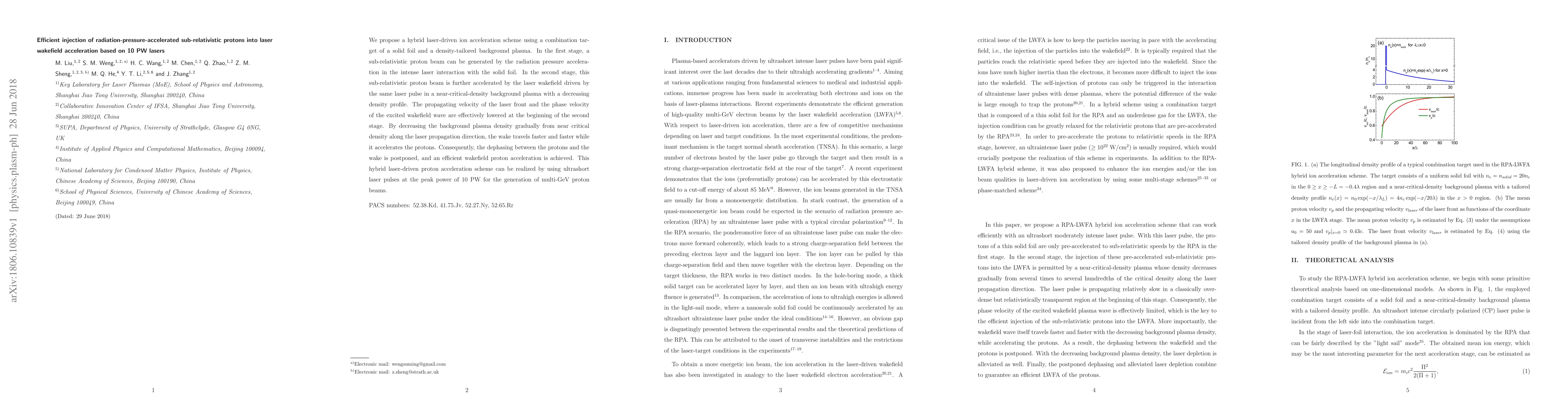 This paper proposes a hybrid laser-driven method to efficiently accelerate sub-relativistic protons using radiation-pressure acceleration followed by laser wakefield acceleration in a density-tailored background plasma, achieving multi-GeV proton beams with 10 PW lasers. The gradual decrease in plasma density enhances proton acceleration and delays dephasing.