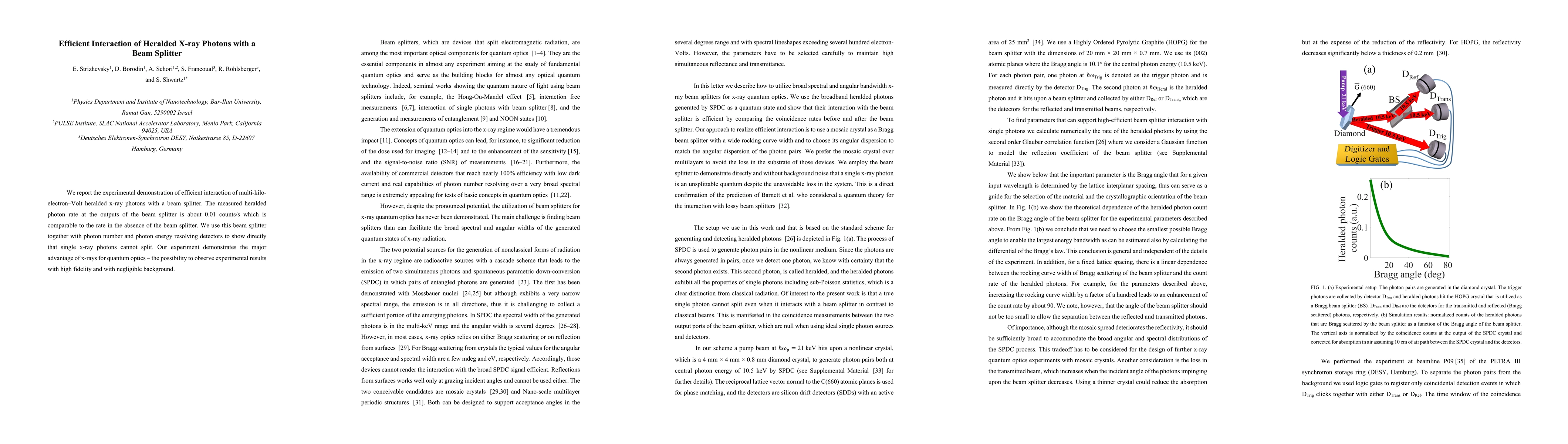 This paper demonstrates efficient interaction of multi-kilo electron Volt heralded x-ray photons with a beam splitter, showing that single x-ray photons do not split, highlighting x-ray's potential for high-fidelity quantum optics experiments. The experiment achieves a heralded photon rate comparable to that without the beam splitter, indicating negligible background interference.