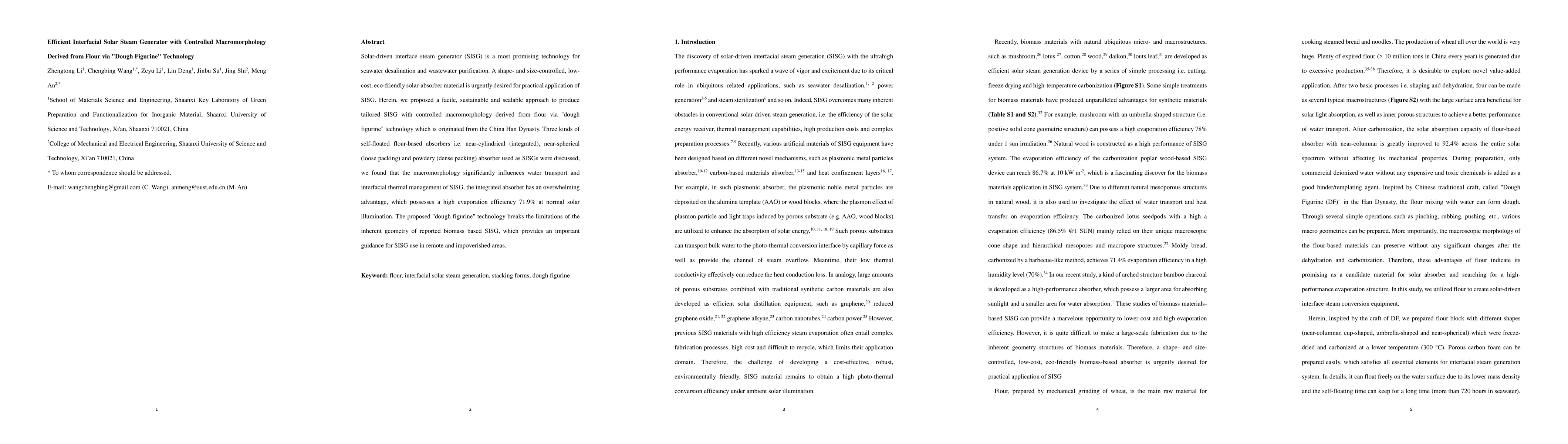 This paper proposes a sustainable, scalable method to create solar-driven interface steam generators (SISG) using flour-based absorbers with controlled macromorphology derived from "dough figurine" technology. The study finds that the integrated near-cylindrical absorber achieves a high evaporation efficiency of 71.9%, demonstrating significant influence of macromorphology on water transport and thermal management.