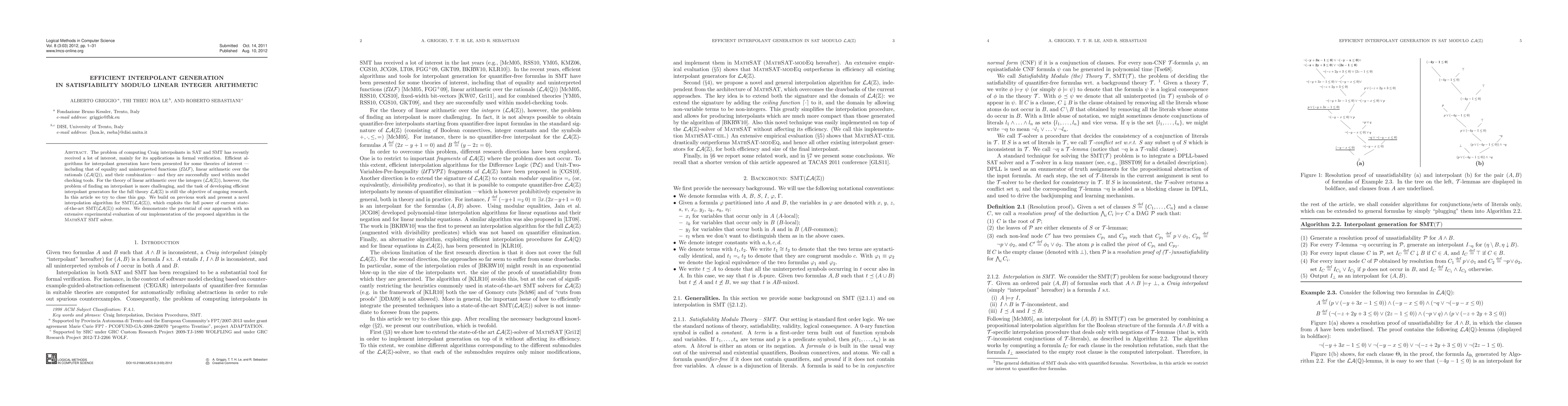 This paper presents a novel interpolation algorithm for Satisfiability Modulo Linear Integer Arithmetic (SMT(LA(Z))), leveraging advanced SMT solvers to improve efficiency. The authors demonstrate the effectiveness of their approach through an extensive experimental evaluation within the MathSAT solver.