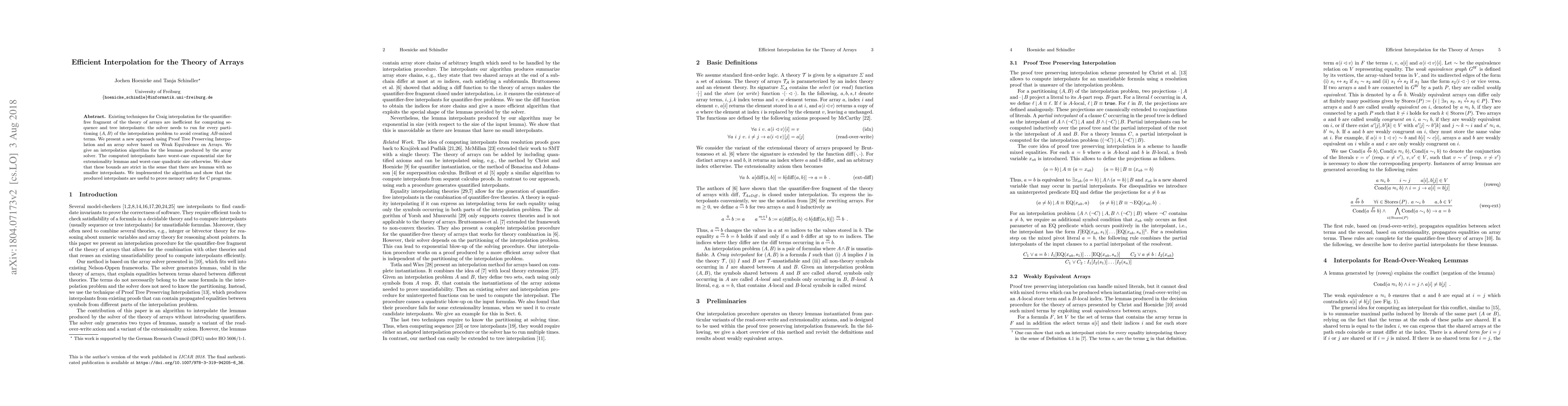 This paper introduces a new approach for efficient interpolation in the theory of arrays, achieving worst-case exponential and quadratic size bounds for interpolants, which is useful for proving memory safety in C programs.