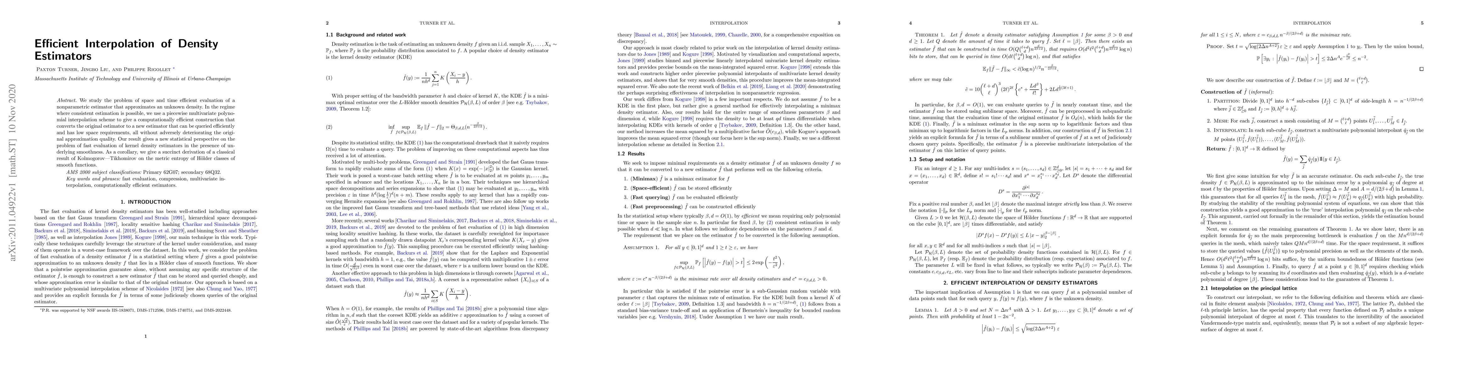 We study the problem of space and time efficient evaluation of a nonparametric estimator that approximates an unknown density. In the regime where consistent estimation is possible, we use a piecewise multivariate polynomial interpolation scheme to give a computationally efficient construction that converts the original estimator to a new estimator that can be queried efficiently and has low space requirements, all without adversely deteriorating the original approximation quality. Our result gives a new statistical perspective on the problem of fast evaluation of kernel density estimators in the presence of underlying smoothness. As a corollary, we give a succinct derivation of a classical result of Kolmogorov---Tikhomirov on the metric entropy of H\"{o}lder classes of smooth functions.