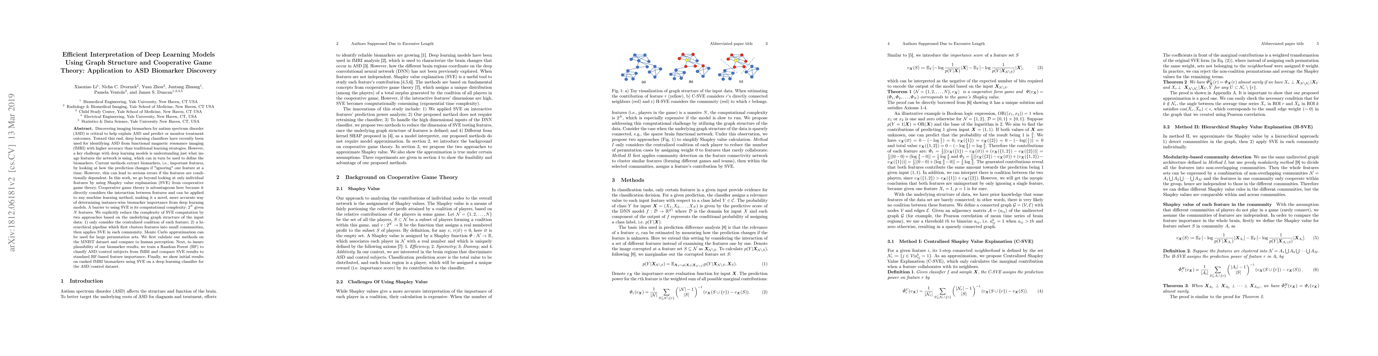 This paper proposes using Shapley value explanation (SVE) from cooperative game theory to interpret deep learning models for identifying imaging biomarkers in autism spectrum disorder (ASD). To address the computational complexity of SVE, the authors develop two approaches based on the graph structure of the data, showing improved efficiency and comparing results to traditional feature importance methods.