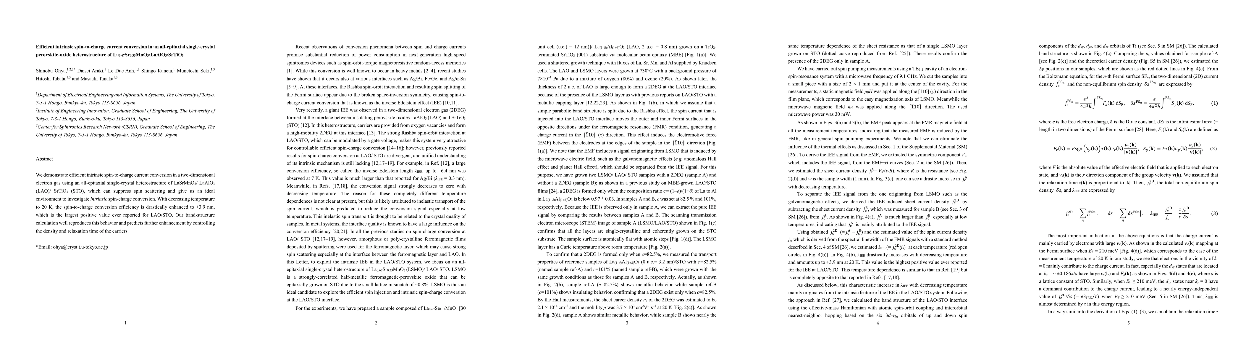 This paper demonstrates efficient intrinsic spin-to-charge current conversion in a perovskite-oxide heterostructure of LaSrMnO3/LaAlO3/SrTiO3, achieving the highest reported spin-to-charge conversion efficiency of +3.9 nm at 20 K. The study highlights the potential for further enhancement by manipulating carrier density and relaxation time.
