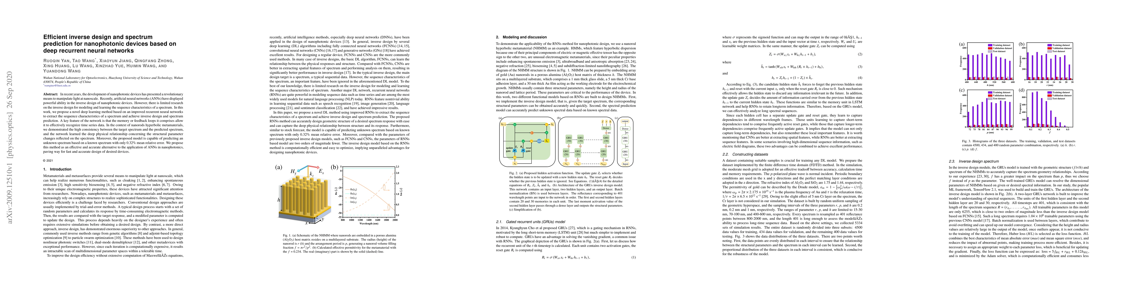 This paper proposes an advanced deep learning method using improved recurrent neural networks for efficient inverse design and spectrum prediction in nanophotonic devices. The model demonstrates high accuracy in predicting unknown spectra based on known ones, showcasing its potential as an effective alternative to traditional ANNs in nanophotonics design.