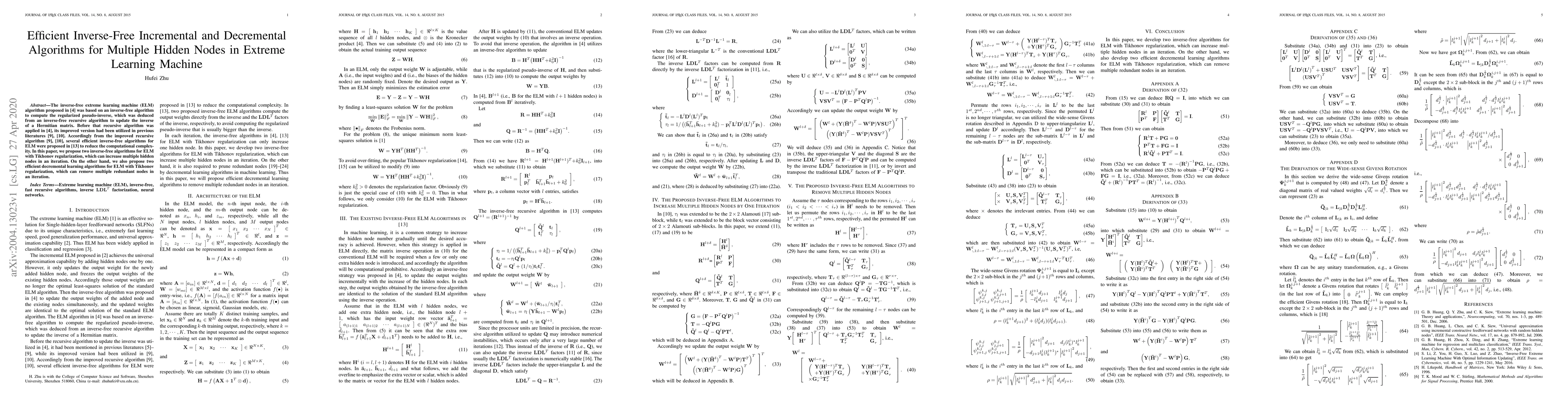 The inverse-free extreme learning machine (ELM) algorithm proposed in [4] was based on an inverse-free algorithm to compute the regularized pseudo-inverse, which was deduced from an inverse-free recursive algorithm to update the inverse of a Hermitian matrix. Before that recursive algorithm was applied in [4], its improved version had been utilized in previous literatures [9], [10]. Accordingly from the improved recursive algorithm [9], [10], several efficient inverse-free algorithms for ELM were proposed in [13] to reduce the computational complexity. In this paper, we propose two inverse-free algorithms for ELM with Tikhonov regularization, which can increase multiple hidden nodes in an iteration. On the other hand, we also propose two efficient decremental learning algorithms for ELM with Tikhonov regularization, which can remove multiple redundant nodes in an iteration.