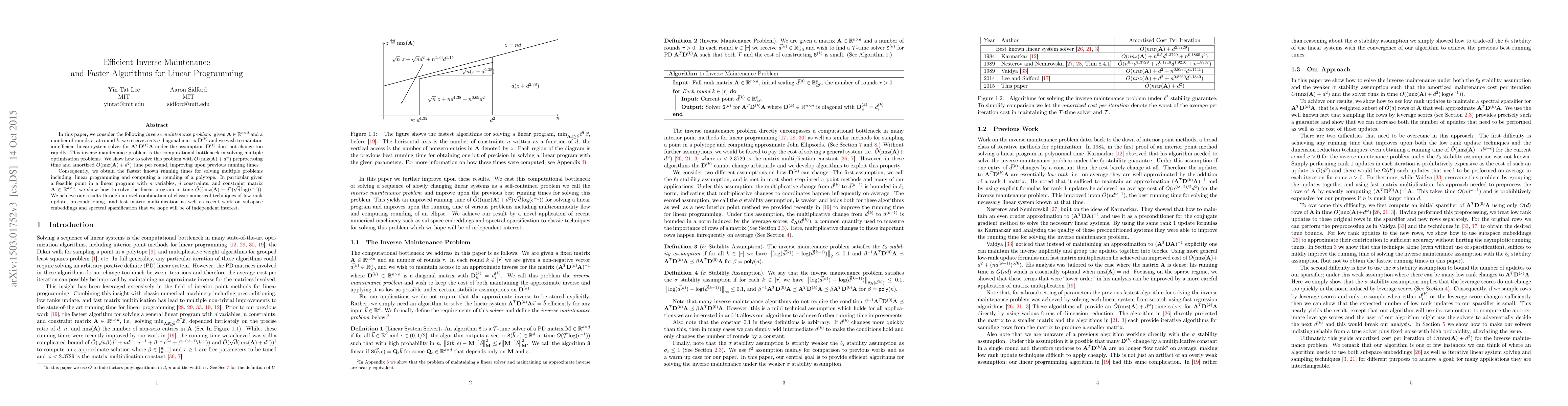 In this paper, we consider the following inverse maintenance problem: given $A \in \mathbb{R}^{n\times d}$ and a number of rounds $r$, we receive a $n\times n$ diagonal matrix $D^{(k)}$ at round $k$ and we wish to maintain an efficient linear system solver for $A^{T}D^{(k)}A$ under the assumption $D^{(k)}$ does not change too rapidly. This inverse maintenance problem is the computational bottleneck in solving multiple optimization problems. We show how to solve this problem with $\tilde{O}(nnz(A)+d^{\omega})$ preprocessing time and amortized $\tilde{O}(nnz(A)+d^{2})$ time per round, improving upon previous running times for solving this problem. Consequently, we obtain the fastest known running times for solving multiple problems including, linear programming and computing a rounding of a polytope. In particular given a feasible point in a linear program with $d$ variables, $n$ constraints, and constraint matrix $A\in\mathbb{R}^{n\times d}$, we show how to solve the linear program in time $\tilde{O}(nnz(A)+d^{2})\sqrt{d}\log(\epsilon^{-1}))$. We achieve our results through a novel combination of classic numerical techniques of low rank update, preconditioning, and fast matrix multiplication as well as recent work on subspace embeddings and spectral sparsification that we hope will be of independent interest.