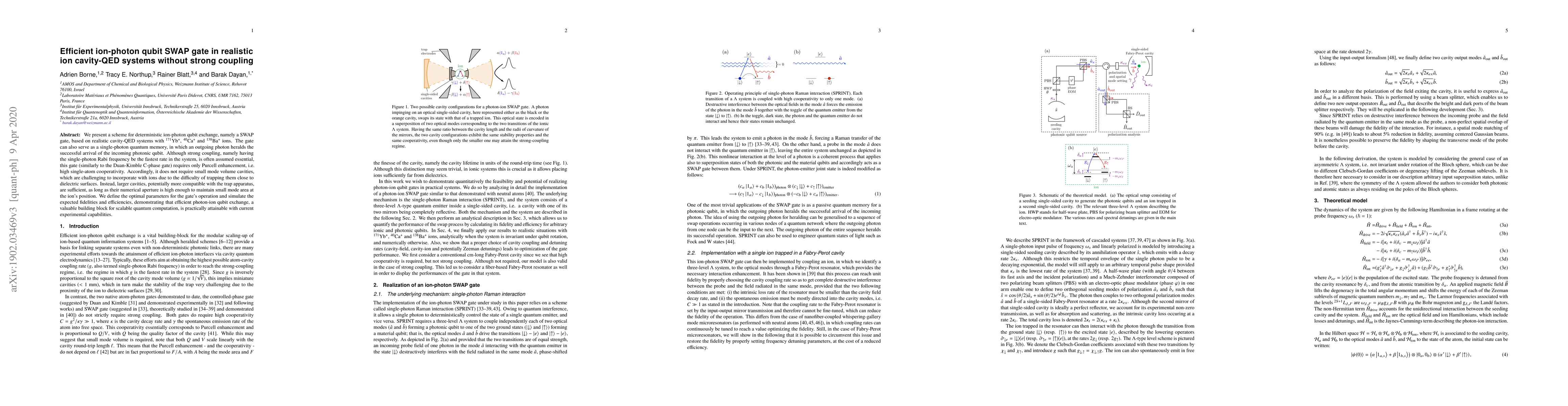 This paper proposes a scheme for a deterministic ion-photon SWAP gate using realistic cavity-QED systems with ion species like 171Yb+, 40Ca+, and 138Ba+. It demonstrates that efficient qubit exchange is feasible without requiring strong coupling, only needing Purcell enhancement and larger, yet suitably high-aperture cavities.