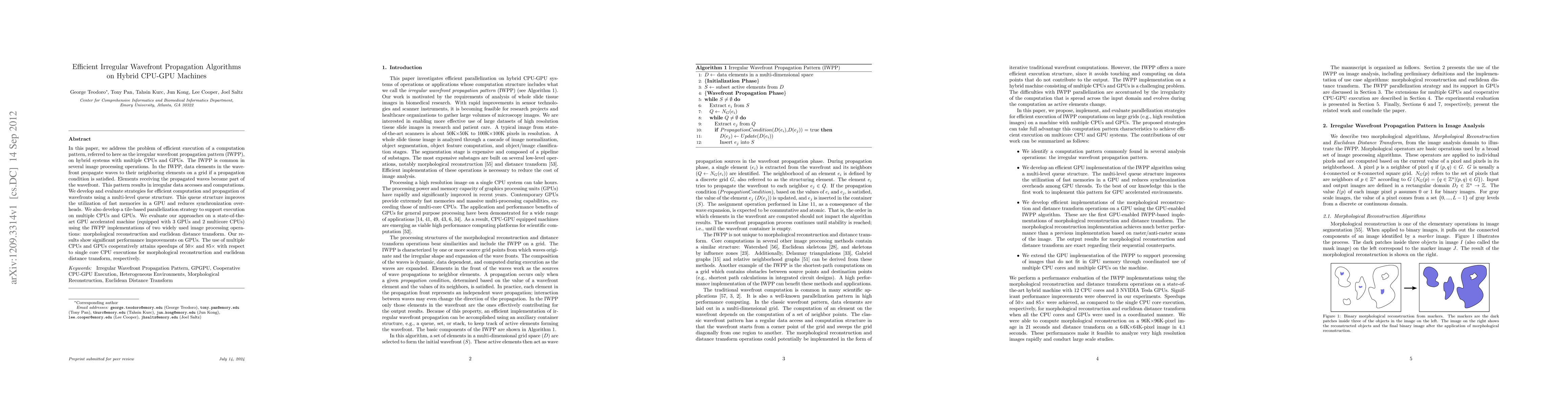 This paper develops algorithms for efficient execution of irregular wavefront propagation patterns on hybrid CPU-GPU systems, achieving significant performance improvements and up to 85x speedups compared to single CPU cores, using multi-level queue structures and a tile-based parallelization strategy.