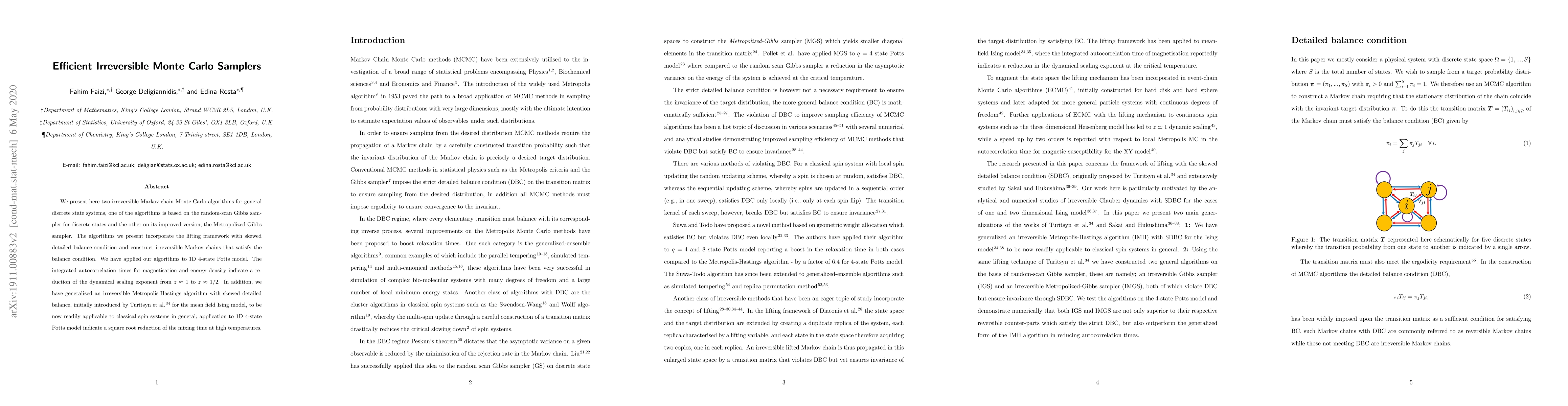 Researchers developed two irreversible Markov chain Monte Carlo algorithms to efficiently simulate complex systems, achieving a reduction in dynamical scaling exponent and mixing time for the 1D Potts model.