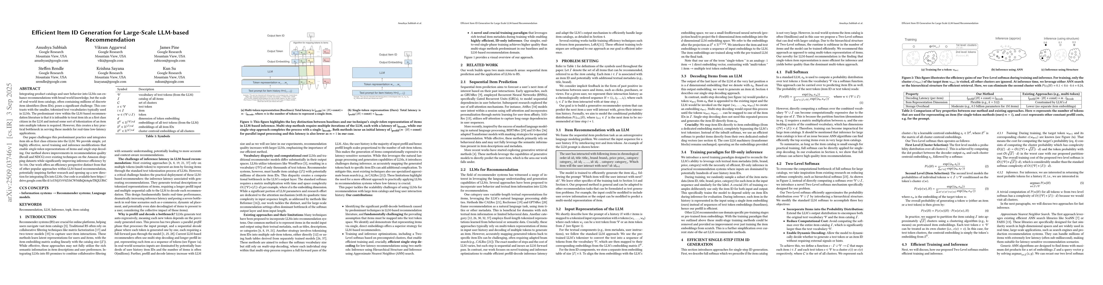 Integrating product catalogs and user behavior into LLMs can enhance recommendations with broad world knowledge, but the scale of real-world item catalogs, often containing millions of discrete item identifiers (Item IDs), poses a significant challenge. This contrasts with the smaller, tokenized text vocabularies typically used in LLMs. The predominant view within the LLM-based recommendation literature is that it is infeasible to treat item ids as a first class citizen in the LLM and instead some sort of tokenization of an item into multiple tokens is required. However, this creates a key practical bottleneck in serving these models for real-time low-latency applications. Our paper challenges this predominant practice and integrates item ids as first class citizens into the LLM. We provide simple, yet highly effective, novel training and inference modifications that enable single-token representations of items and single-step decoding. Our method shows improvements in recommendation quality (Recall and NDCG) over existing techniques on the Amazon shopping datasets while significantly improving inference efficiency by 5x-14x. Our work offers an efficiency perspective distinct from that of other popular approaches within LLM-based recommendation, potentially inspiring further research and opening up a new direction for integrating IDs into LLMs. Our code is available here https://drive.google.com/file/d/1cUMj37rV0Z1bCWMdhQ6i4q4eTRQLURtC