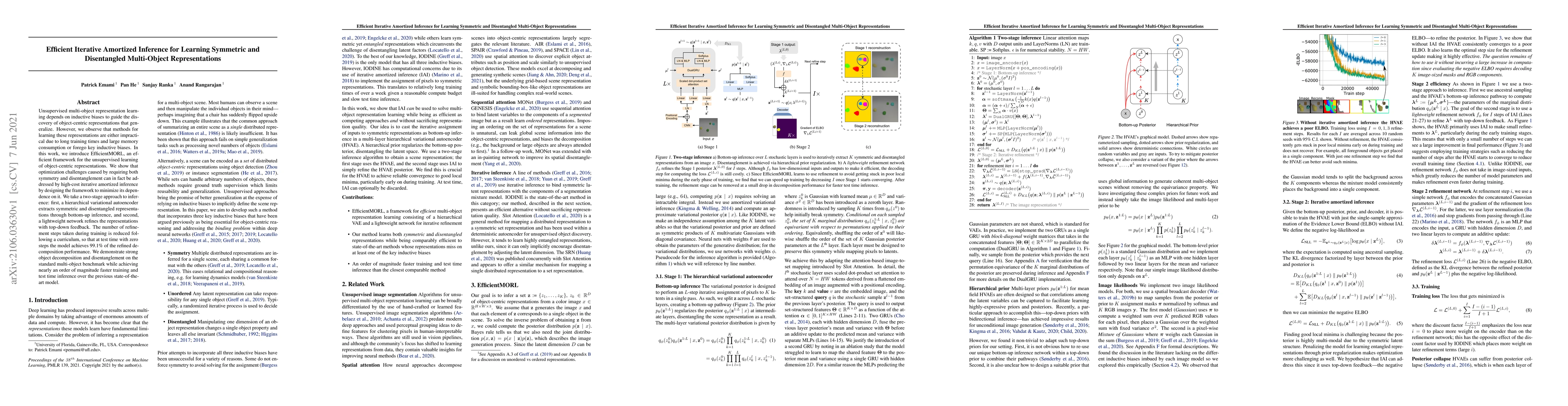 This paper introduces EfficientMORL, an efficient framework for unsupervised learning of symmetric and disentangled multi-object representations, addressing long training times and memory consumption. It employs a two-stage hierarchical variational autoencoder and refinement network, achieving nearly an order of magnitude faster training and test inference compared to previous models.