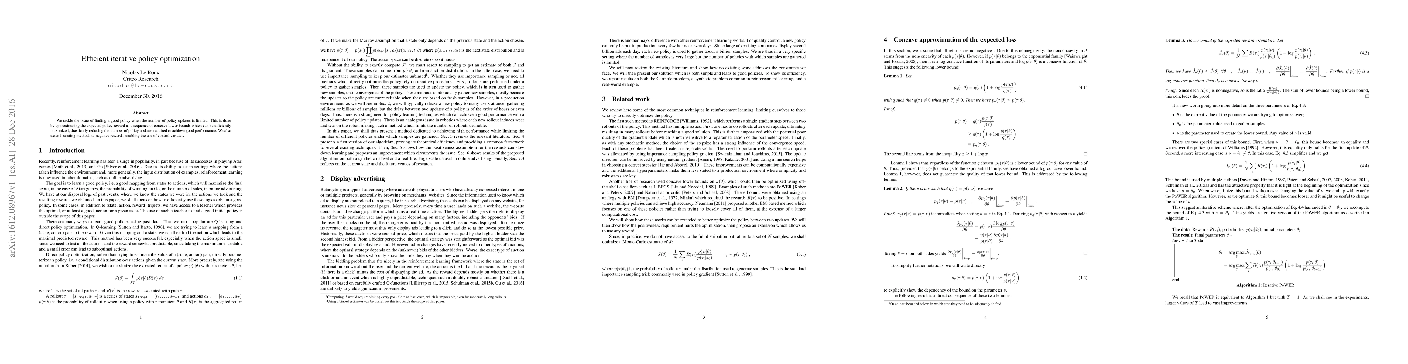 We tackle the issue of finding a good policy when the number of policy updates is limited. This is done by approximating the expected policy reward as a sequence of concave lower bounds which can be efficiently maximized, drastically reducing the number of policy updates required to achieve good performance. We also extend existing methods to negative rewards, enabling the use of control variates.