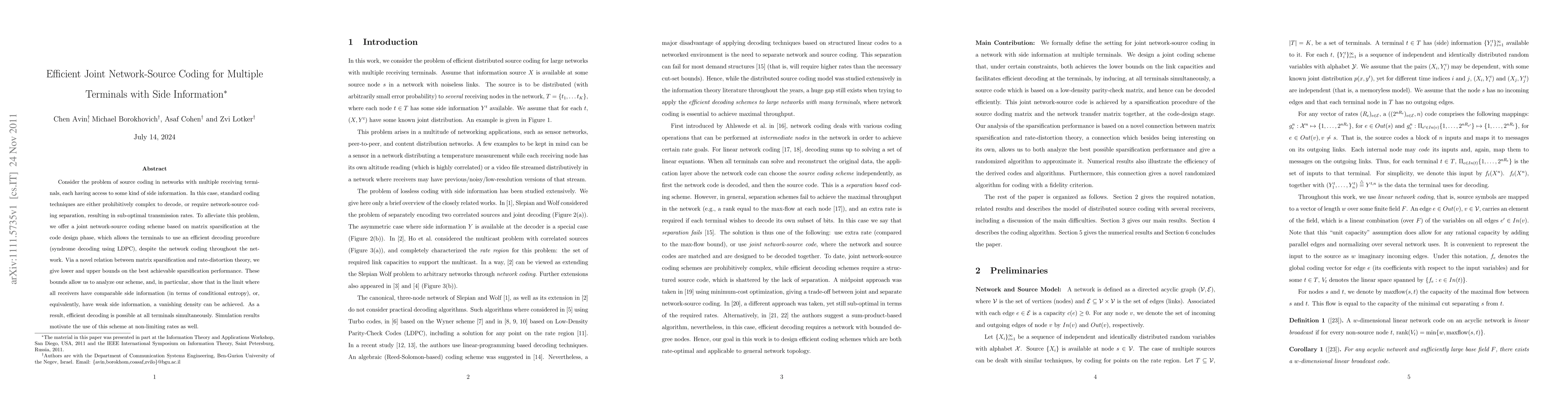 This paper proposes a joint network-source coding scheme using matrix sparsification for multiple terminals with side information, enabling efficient decoding via syndrome decoding with LDPC. The scheme achieves vanishing density in the limit of weak side information, allowing simultaneous decoding at all terminals.