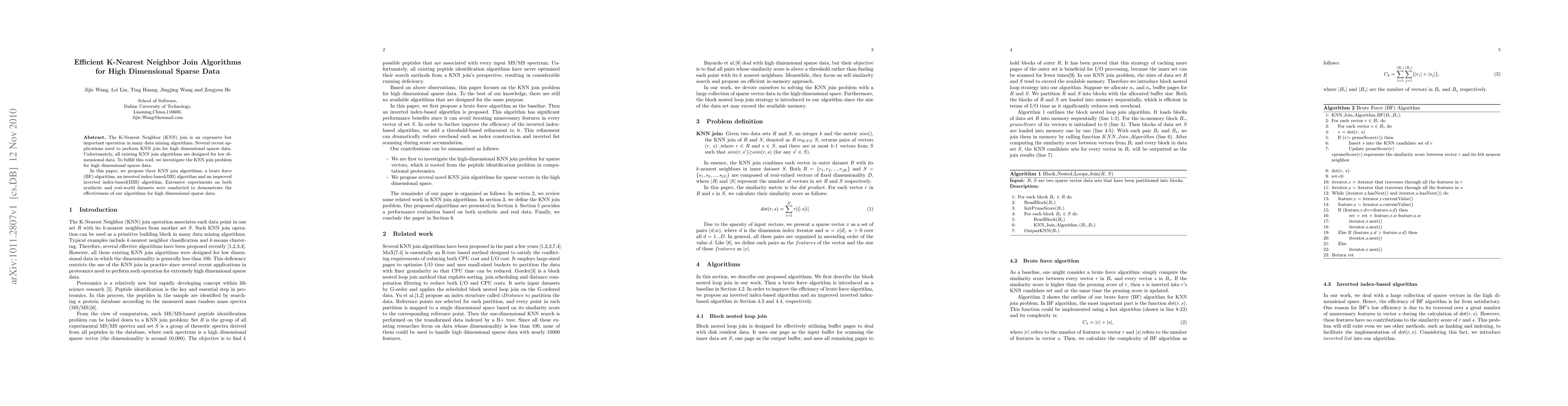 This paper proposes three KNN join algorithms—brute force, inverted index-based, and improved inverted index-based—to efficiently handle high dimensional sparse data, which is a gap in existing low-dimensional data algorithms. Experimental results on synthetic and real datasets show the effectiveness of the proposed methods.