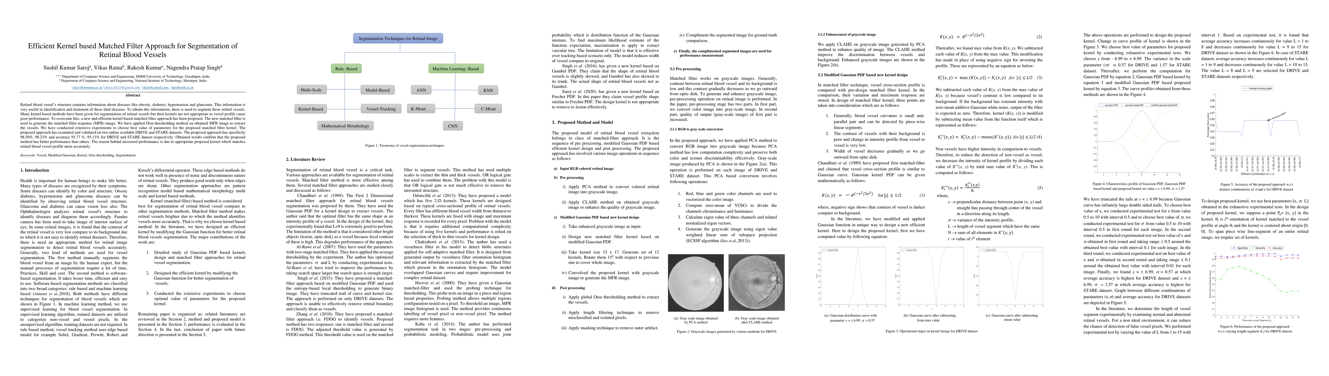 This paper proposes an efficient kernel-based matched filter approach for segmenting retinal blood vessels, achieving high specificity and accuracy. The method uses a custom kernel to generate a matched filter response, followed by Otsu thresholding for vessel extraction, outperforming existing methods due to its better match to the vessel profile.