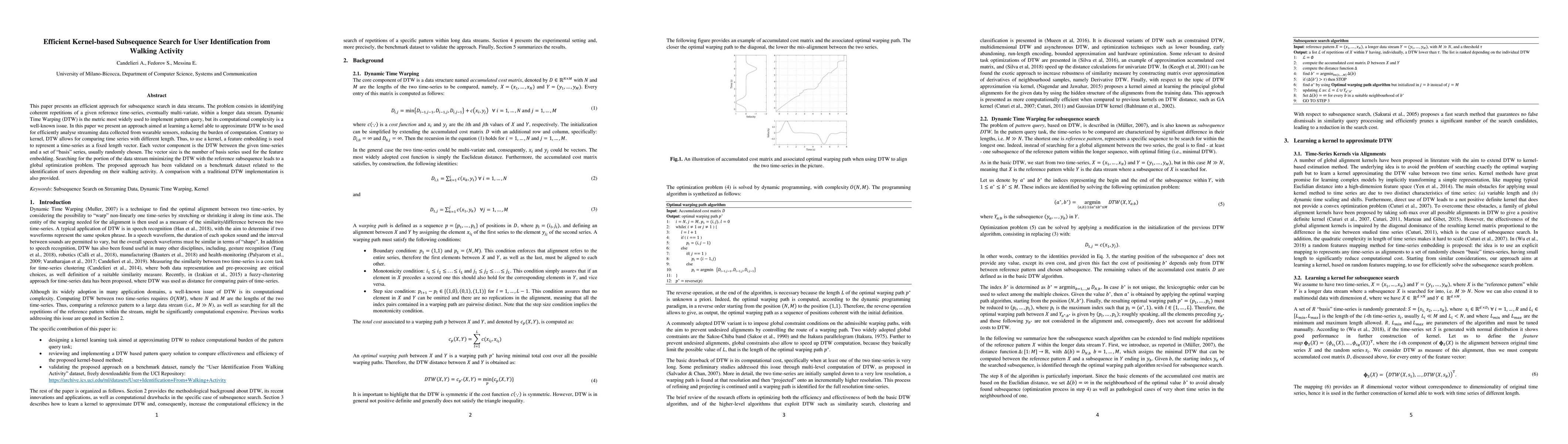 This paper presents an efficient approach for subsequence search in data streams. The problem consists in identifying coherent repetitions of a given reference time-series, eventually multi-variate, within a longer data stream. Dynamic Time Warping (DTW) is the metric most widely used to implement pattern query, but its computational complexity is a well-known issue. In this paper we present an approach aimed at learning a kernel able to approximate DTW to be used for efficiently analyse streaming data collected from wearable sensors, reducing the burden of computation. Contrary to kernel, DTW allows for comparing time series with different length. Thus, to use a kernel, a feature embedding is used to represent a time-series as a fixed length vector. Each vector component is the DTW between the given time-series and a set of 'basis' series, usually randomly chosen. The vector size is the number of basis series used for the feature embedding. Searching for the portion of the data stream minimizing the DTW with the reference subsequence leads to a global optimization problem. The proposed approach has been validated on a benchmark dataset related to the identification of users depending on their walking activity. A comparison with a traditional DTW implementation is also provided.