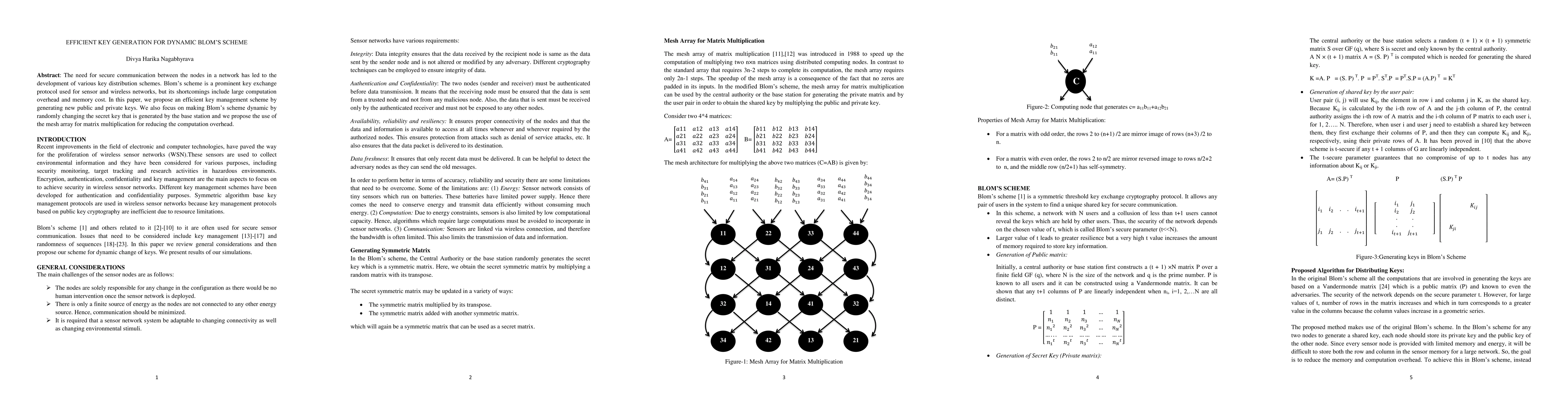 This paper introduces an efficient key management scheme for dynamic Blom's scheme, focusing on generating new public and private keys while dynamically altering the secret key. The use of a mesh array for matrix multiplication is proposed to reduce computational overhead.